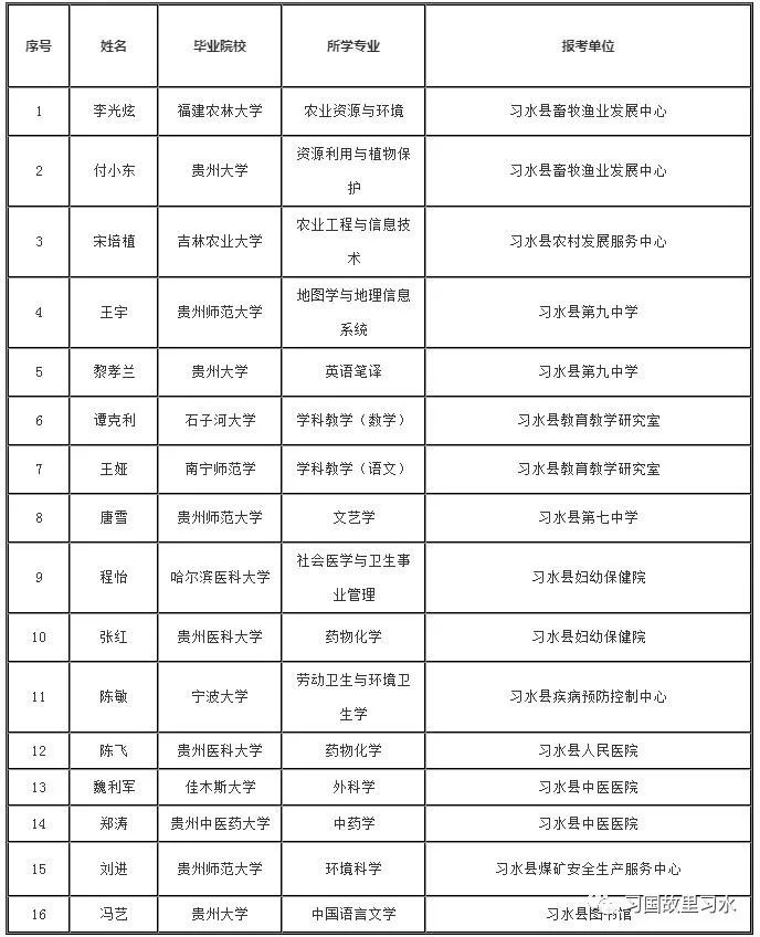 根据《遵义市人力资源和社会保障局关于做好第十一届贵州人才博览会事业单位引进人才有关工作的通知》(遵市人社通〔2023〕9号)、《2023年第十一届贵州人才博览会遵义市事业单位人才引进公告》等有关文件精神,现将习水县2023年第十一届贵州人才博览会线下考核通过人员名单予以公示,公示期间,如有异议,请向有关单位反映。(来源:习水县人民政府网)