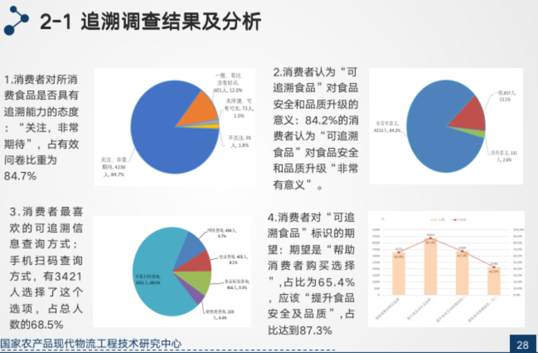 在报告专题研究-追溯调查分析部分,给出追溯调查结论及建议“通过调查,我们发现消费者对食品可追溯体系了解还很不够深入。政府相关管理部门应当努力普及食品信息追溯的相关知识,加强对消费者的宣传,加大宣传教育力度。由于食品可追溯体系的建设与运行而导致的成本增加最终会通过价格机制传导给消费者,因此,政府应当在充分考虑普通消费者对可追溯食品的价格承受能力的基础上,通过各种补贴方式,鼓励食品生产企业开展可追溯体系建设。加强企业追溯责任,可追溯体系的建立本质是企业作为控制风险点、明确责任的要求。企业追溯体系建设是食品追溯体系建设的前提条件,企业应在自身能力范围之内形成辐射全国、连接城乡的追溯网络, 打造一条从生产、流通到消费的全过程信息化追溯链条。”