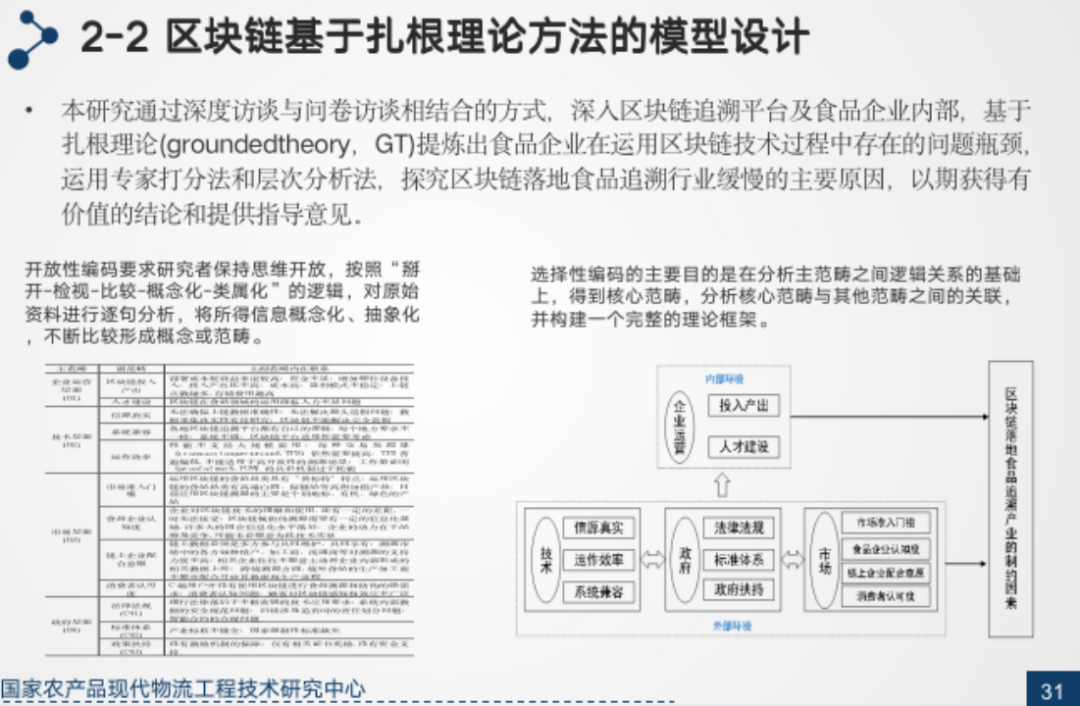 在报告专题研究-区块链落地性部分,报告中指出,从企业经营层面看,区块链投入产出不高,成本较效益来说要高很多,主要表现在硬件设备的投入占很大的比例;盈利模式不稳定,数据存储费用较高;另外面临企业人力不足等问题;区块链防伪溯源需要一定的信息化基础,许多大的企业信息化水平落后;企业的动力在品牌及竞争,不愿意为区块链技术买单。在技术层面上看,数据采集真实性有待研究,无法确保上链数据的准确性,无法解决源头数据造假问题;各地区区块链平台都有自己的逻辑,每个地方要求不一样,缺乏系统兼容性,需要进一步考虑区块链平台适用性;性能不支持大规模商用,交易处理量普遍偏低,不能适用于高并发性的溯源场景,需要进一步提高,工作量证明的共识机制过于耗能。从市场层面看,市场准入门槛较高,运用区块链的食品品类具有“贵标特”特点,如高端白酒、保健品、个别地标产品、有机和绿色产品等;企业对区块链技术的理解和认知还有一定的差距,一时无法接受;链上数据必须是多方参与、共同维护、共同享有,但是溯源市场中的各方如种植户、加工商、流通商等往往不愿意主动将企业内部形成的相关数据上传,跨境溯源方面,境外的企业不愿意配合开放其数据和生产流程。另外,由于消费者认知问题,没有使用区块链进行食品溯源的强烈需求。从政府层面看,当前的法律法规落后于不断发展的技术应用要求,系统内部数据的安全规范问题,后续涉及追责时的责任划分问题,智能合约的合规问题等等;区块链产业标准不健全,相关国家标准缺失;没有激励机制的保障,仅有相关证书,没有资金支持等。