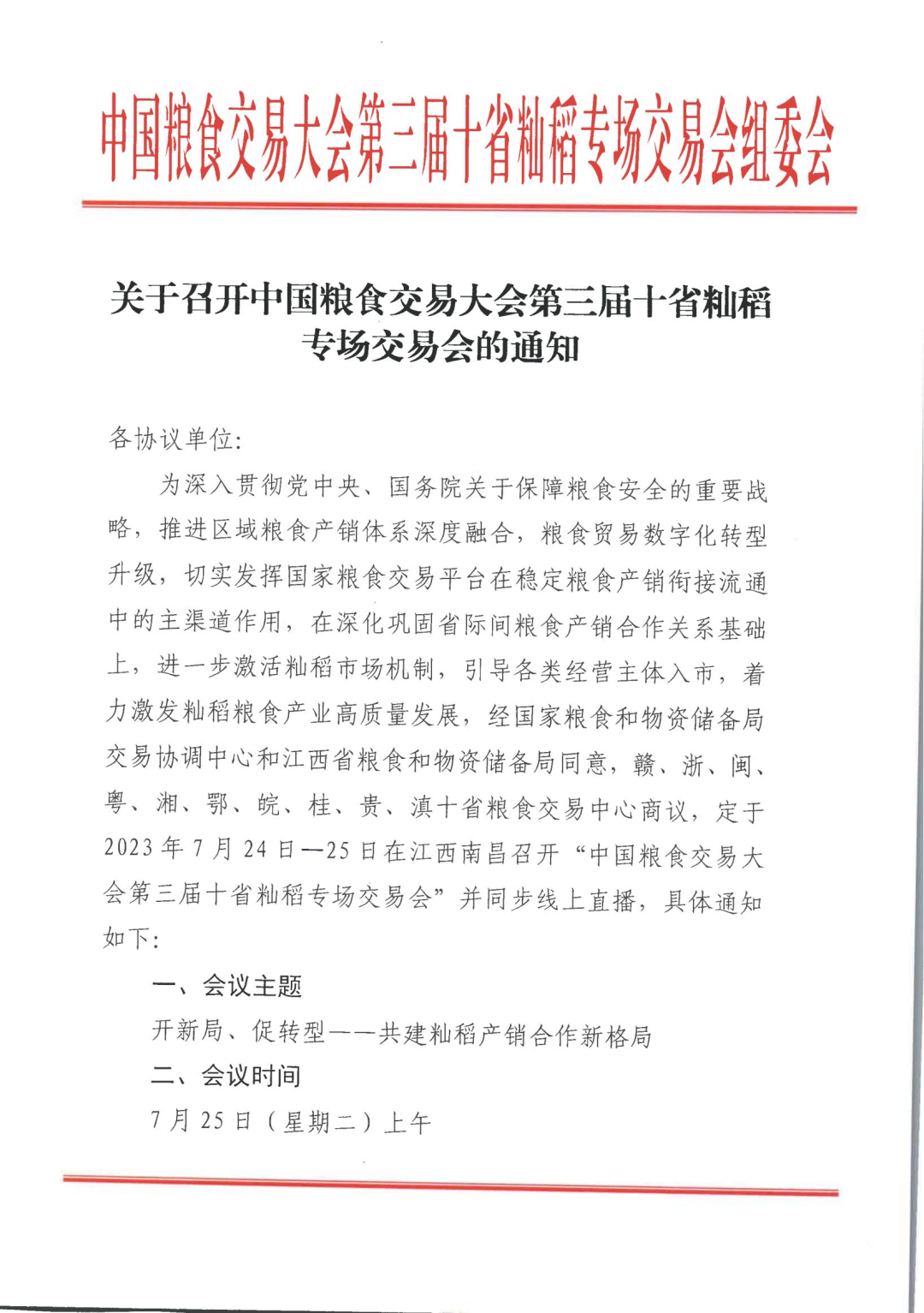 关于召开中国粮食交易大会第三届十省籼稻专场交易会的通知