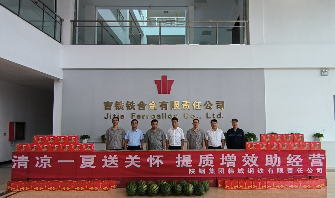 最后,李景辉副总经理代表陕钢集团韩城钢铁有限责任公司向“战略客户”——吉铁铁合金开展了“送清凉”赠礼活动。吉铁郭军董事长代表公司接收了礼品并向李景辉副总经理表示感谢。(吉铁董事长郭军、副总经理李勇丹与陕钢集团韩城钢铁有限责任公司李景辉副总经理一行来宾合影) 郭军董事长表示,非常感谢陕钢集团韩城钢铁有限责任公司为吉铁在炎炎夏日送来了一份清凉舒畅,一份暖心关怀,吉铁非常珍惜双方多年来积淀的牢固合作关系,未来吉铁将不断提升合金产品质量,做好售后服务,本着用户至上的原则,不断加强创新和研发,为陕钢集团韩城钢铁有限责任公司提供更加优质的产品,实现企业的高质量发展。 李景辉副总经理表示,此次业务交流为双方今后深化合作奠定了基础,双方均高度重视多年来彼此稳定良好的合作关系,作为战略合作伙伴,希望未来双方能够进一步巩固合作关系,共同开创互利共赢发展的新局面。