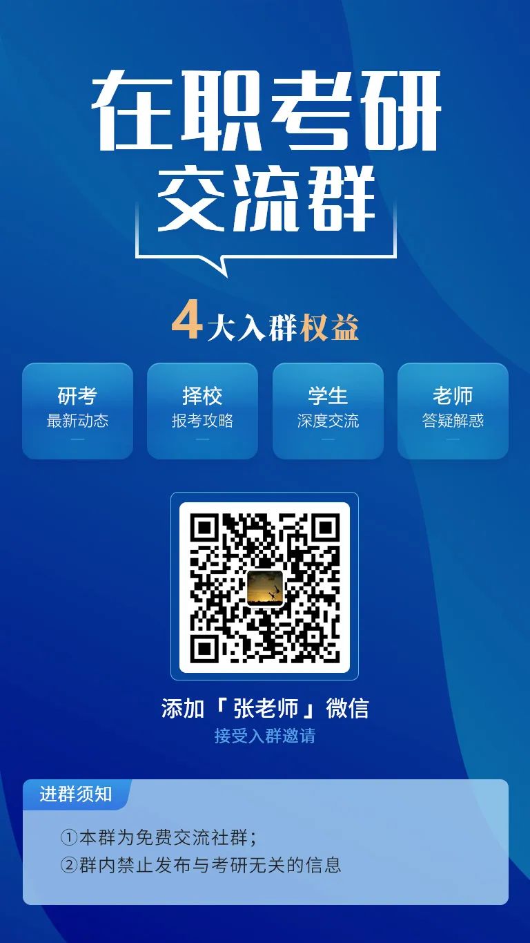 另外,和大家分享一个好消息,我们建立了【在职考研交流群】,这是免费的微信群,每日和大家分享报考干货、最新动态、招生信息等,你还可以和天南海北的小伙们进行交流~