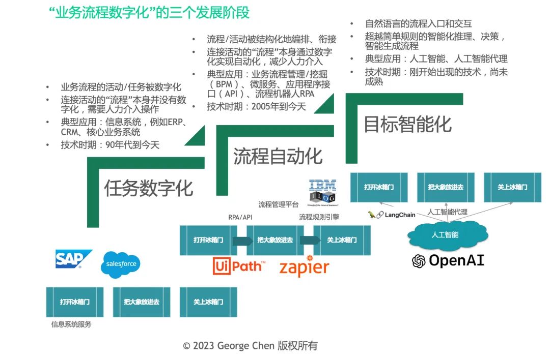 关键技术特点:基于前两代技术,企业业务服务和任务都高度数字化前提下,以目标(goal)为导向,用人工智能来解析、记忆、生成、评估和选择任务,用人工智能代理来操作任务。