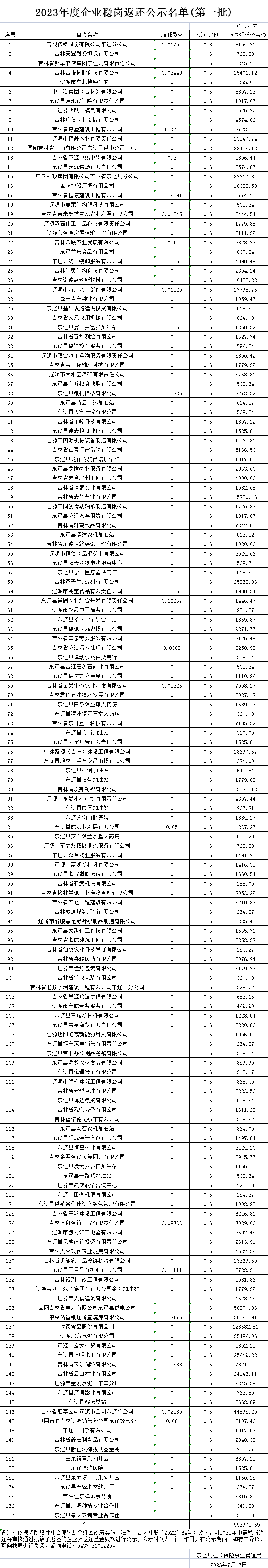 2023年度企业稳岗返还公示名单(第一批)