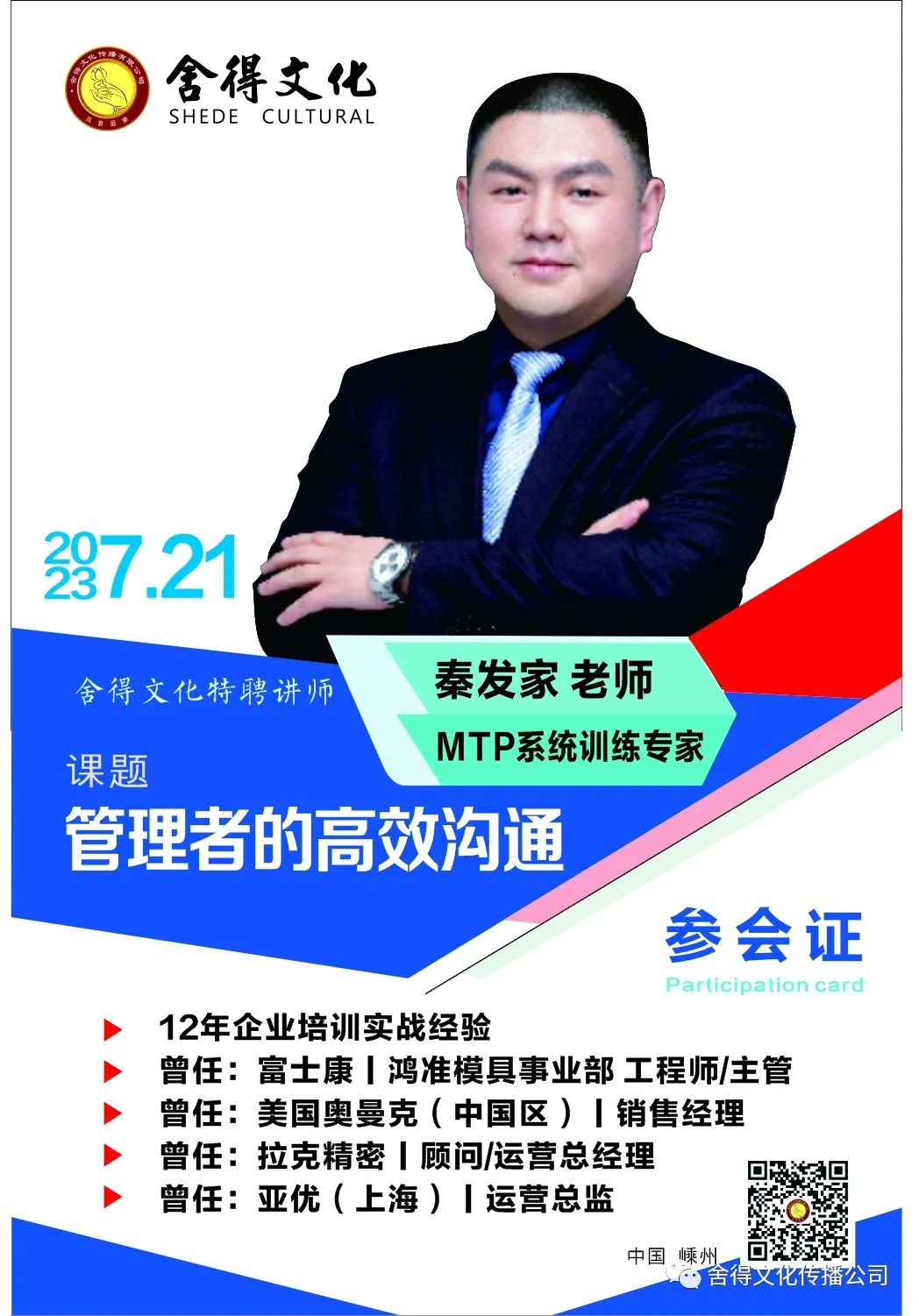 下次课程预告:7月21日,嵊州保罗洲际酒店——舍得文化特聘讲师——秦发家老师《管理者的高效沟通》
