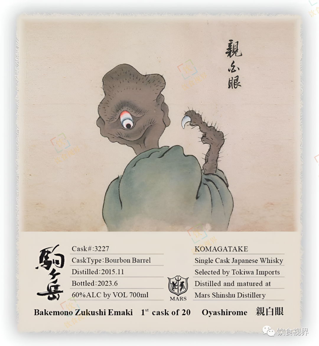 2023年07月03日,网上出现了三套本坊酒造威士忌酒标,根据酒标显示,它们全部隶属于一个全新的威士忌系列——《化物尽绘卷》,这三套酒标对应的分别是此系列的前三款酒。其中首款酒名为亲白眼,使用《化物尽绘卷》的妖怪亲白眼(Oyashirome)作为主题,这个妖怪的后脑勺上,长着一只突出的眼睛,手部只有一根手指,并且带有爪子。这是一款单桶威士忌,2015年11月蒸馏于信州,熟成于桶号为3227的波本桶(Bourbon Barrel),装瓶于2023年06月,酒龄为7年,酒精度数为60%