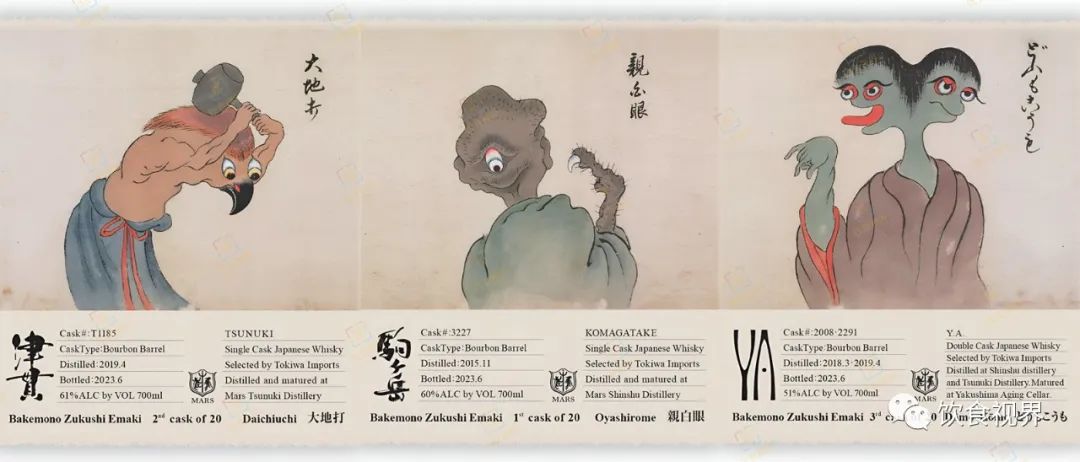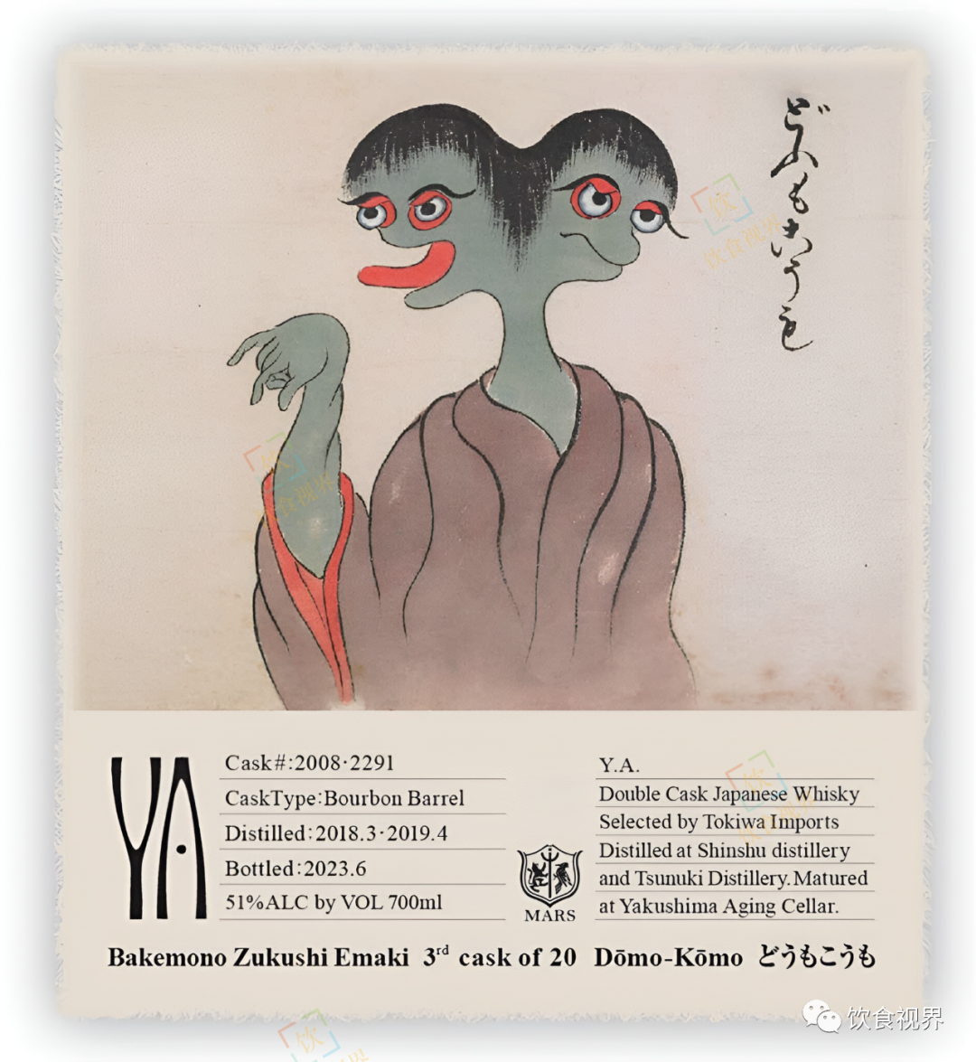 第三款酒名为Dōmo-kōmo(どうもこうも),使用《化物尽绘卷》的Dōmo-kōmo作为主题,Dōmo-kōmo的形象是长着两个头的生物,皮肤呈青灰色。这是一款双桶调和威士忌,其中一桶酒2018年03月蒸馏于信州,熟成于桶号为2008的波本桶,另有一桶酒2019年04月蒸馏于津貫,熟成于桶号为2291的波本桶,这两桶酒均在本坊酒造位于屋久岛的酒窖熟成,装瓶前经过混合调制之后,于2023年06月装瓶,酒龄为4年,酒精度数为51% ABV,容量为700ml。