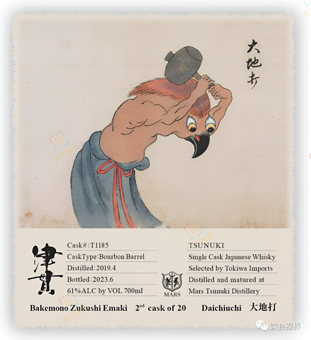 第二款酒名为大地打,使用《化物尽绘卷》的妖怪大地打(Daichiuchi)作为主题,大地打的形象是一个长着一张鸟脸、挥舞着棒槌的怪物。这是一款单桶威士忌,2019年04月蒸馏于津貫,熟成于桶号为T1185的波本桶,装瓶于2023年06月,酒龄为4年,酒精度数为61% ABV,容量为700ml。