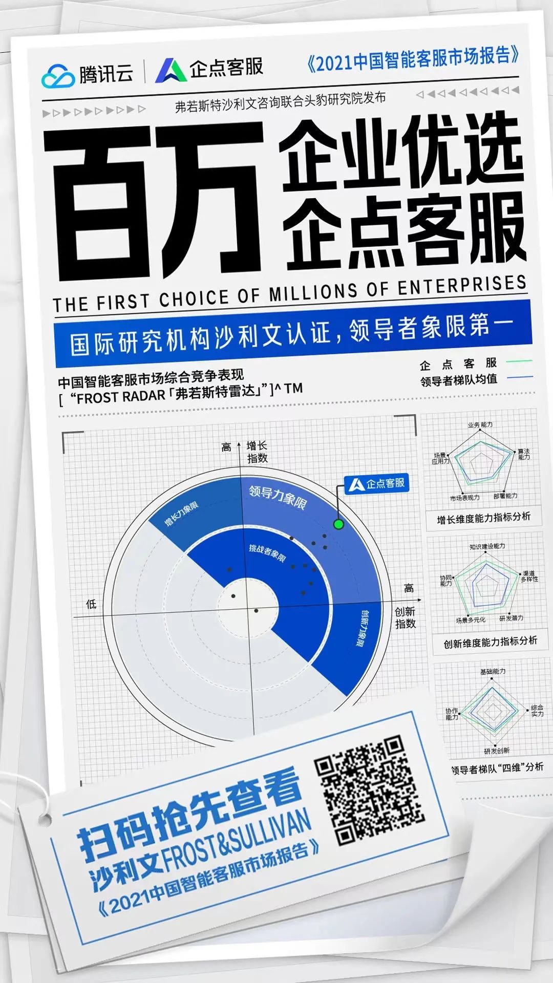 据国际研究机构FROST&SULLIVAN最新推出的《2021中国智能客服市场报告》报告,目前腾讯企点位列智能客服领导者象限第一。