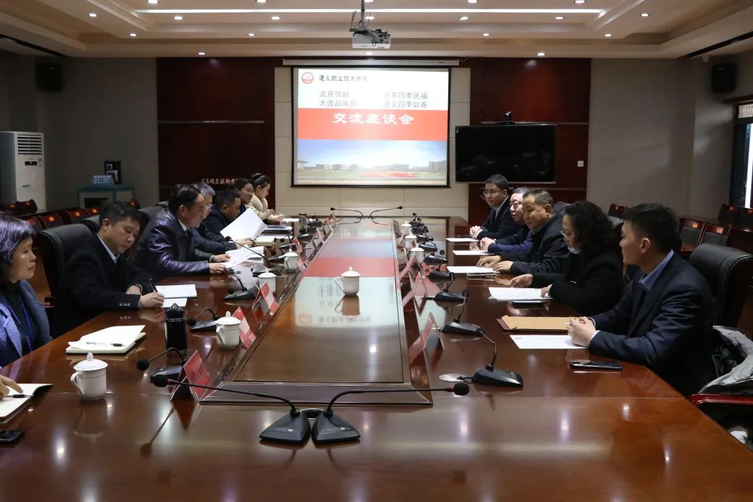 3月5日,北京悦融餐饮公司总经理李浩,北京四季民福餐饮公司副总经理李顺军、人事经理曾小栋一行来学院合作交流座谈,学院党委副书记高翔、副院长凃祥策、副院长温龙岚出席座谈会,并携有关系部负责人进行了热情接待、友好洽谈。大连品味居董事长于涛先生派代表参加了座谈会,遵义四季如春餐饮公司总经理、学院客座教授沈四春参加座谈。