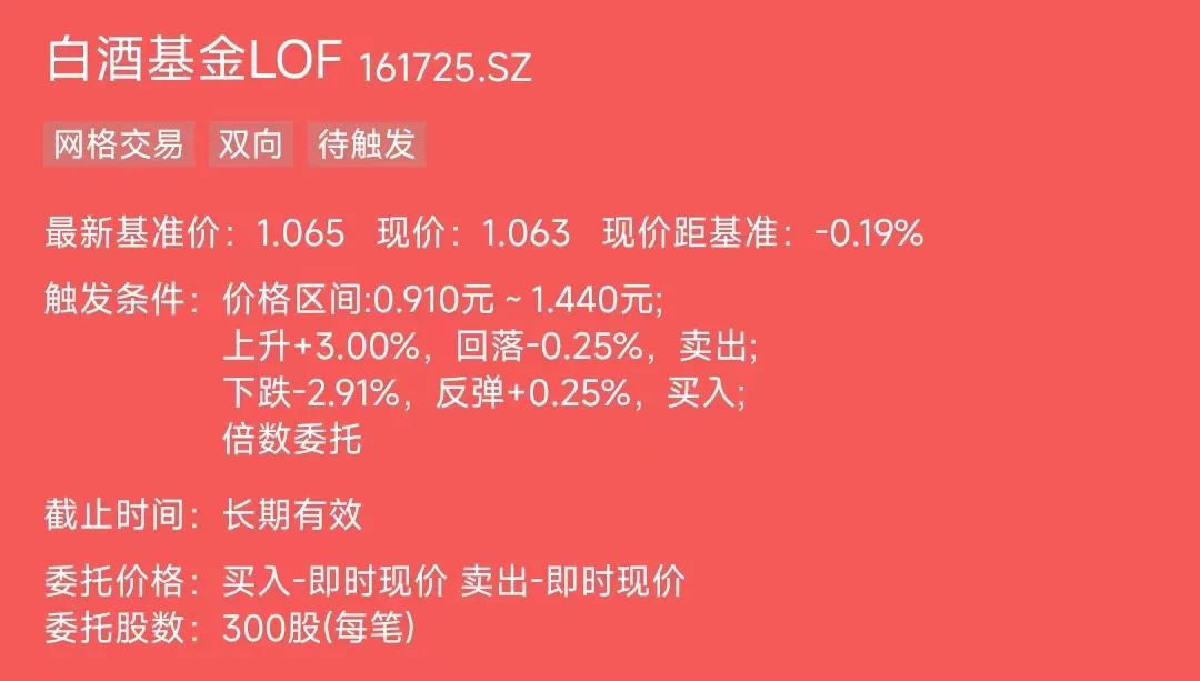 1、因为我持有白酒LOF的券商不支持回落和反弹功能的网格条件单,所以我没用这个策略,且我用的策略比这个差不少,下步考虑换过来;