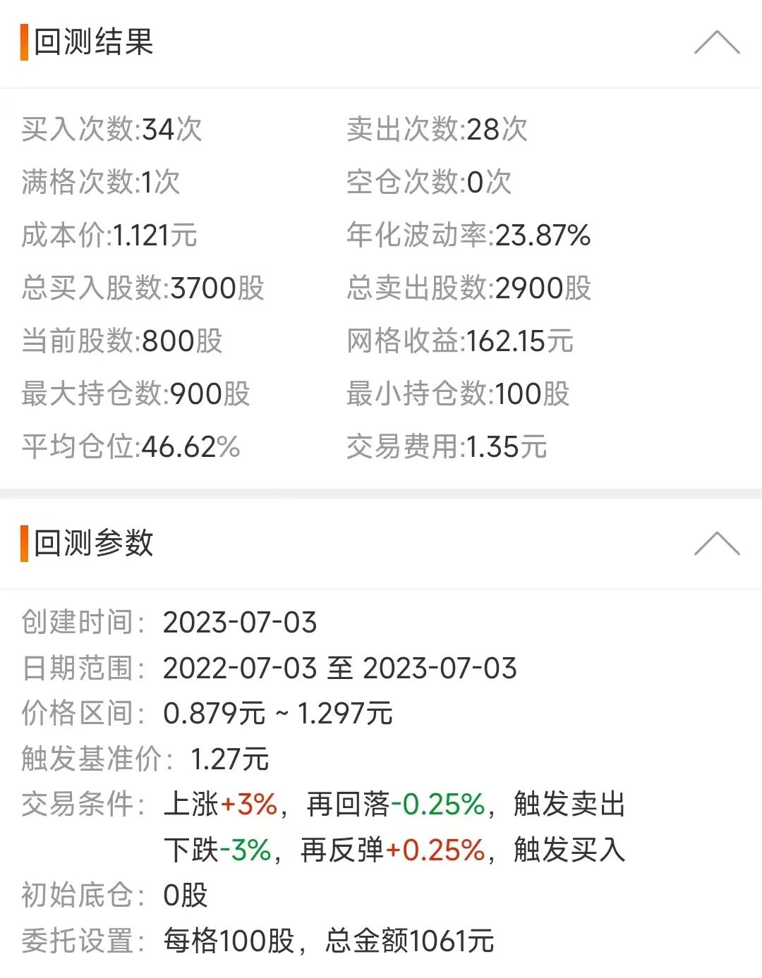 2、确定网格间隔。这个地方可以参考《券商ETF网格条件单2.0》,我预估的最大投入就是5000元左右,结合一下均价,估计出最大持仓。这次设置参数和上次不一样,因为经过多次回测,发现3%间隔收益较高,然后根据资金量决定每网是300股,回测一下,见下图(回测公众号:指汇盈微服务,参数是测试了几次选出来的,以下收益率是建立在有回落和反弹功能的条件单,如果没有的话收益较平庸。大家可以自己试):