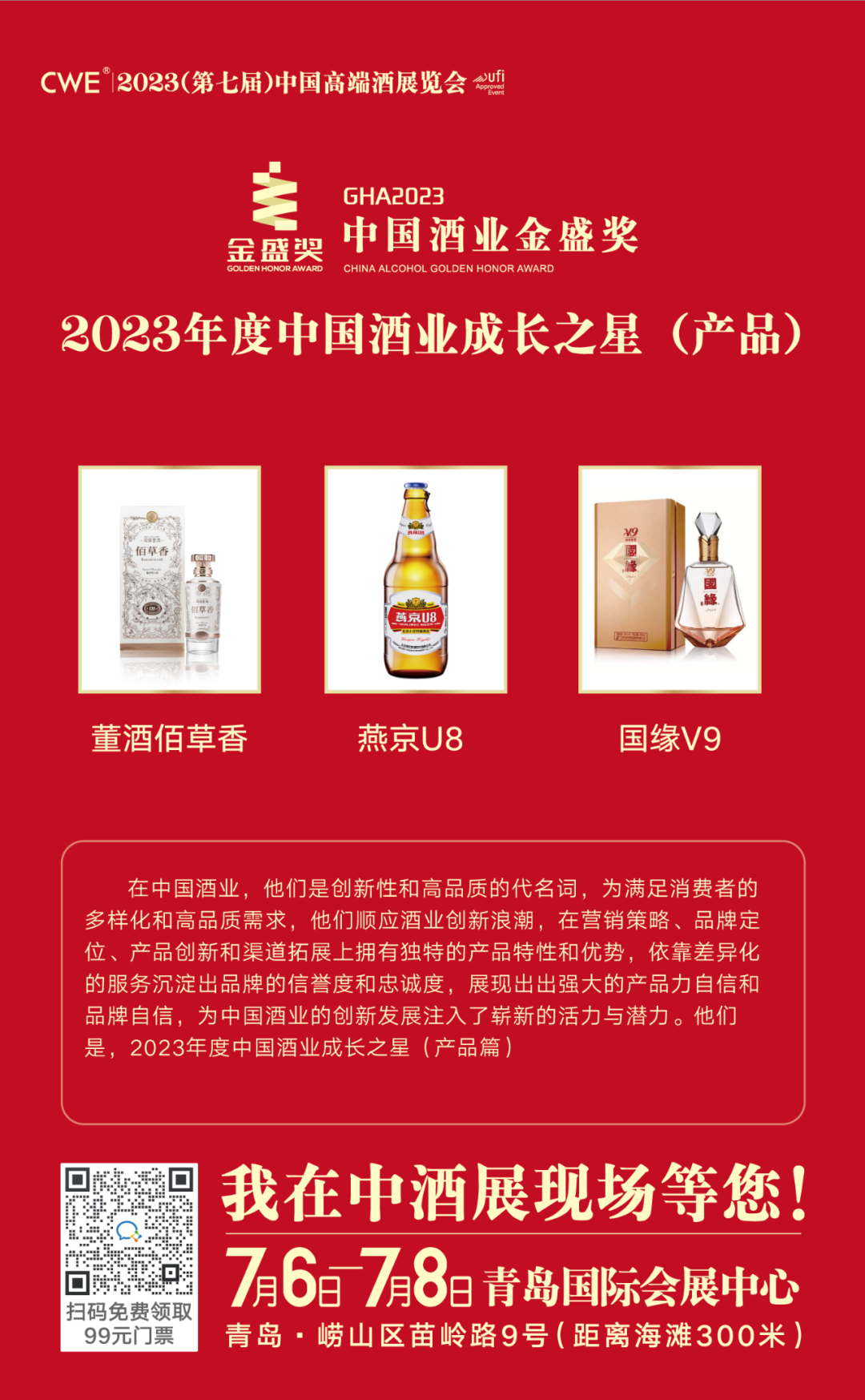 董酒佰草香、燕京U8、国缘V9荣获“2023年度中国酒业成长之星(产品)”奖。