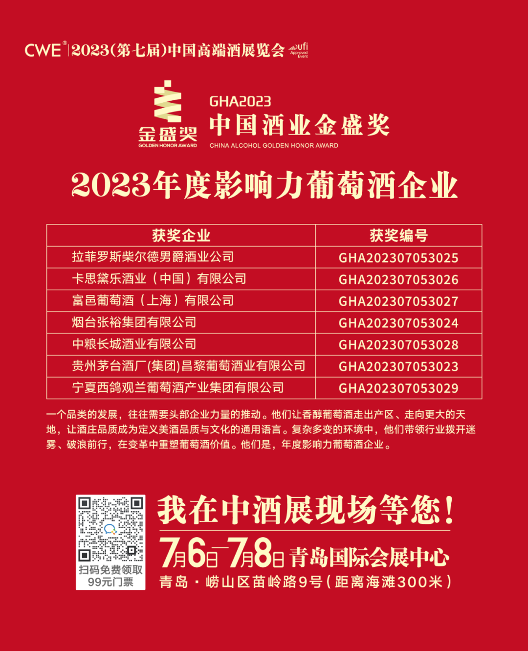 拉菲罗斯柴尔德男爵酒业公司、卡思黛乐酒业(中国)有限公司、富邑葡萄酒(上海)有限公司等7家企业荣获“2023年度影响力葡萄酒企业”奖。