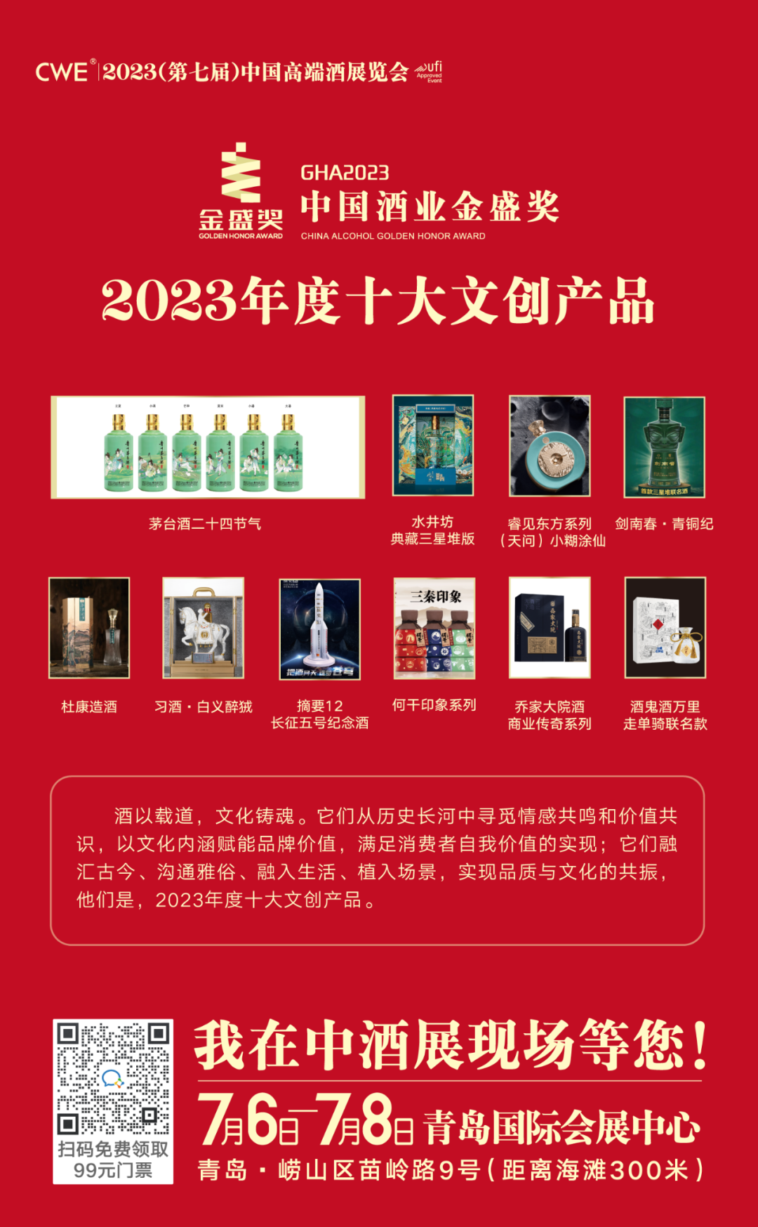 茅台二十四节气、水井坊典藏三星堆版、睿见东方系列(天问)小糊涂仙等10个产品荣获“2023年度十大文创产品”奖。