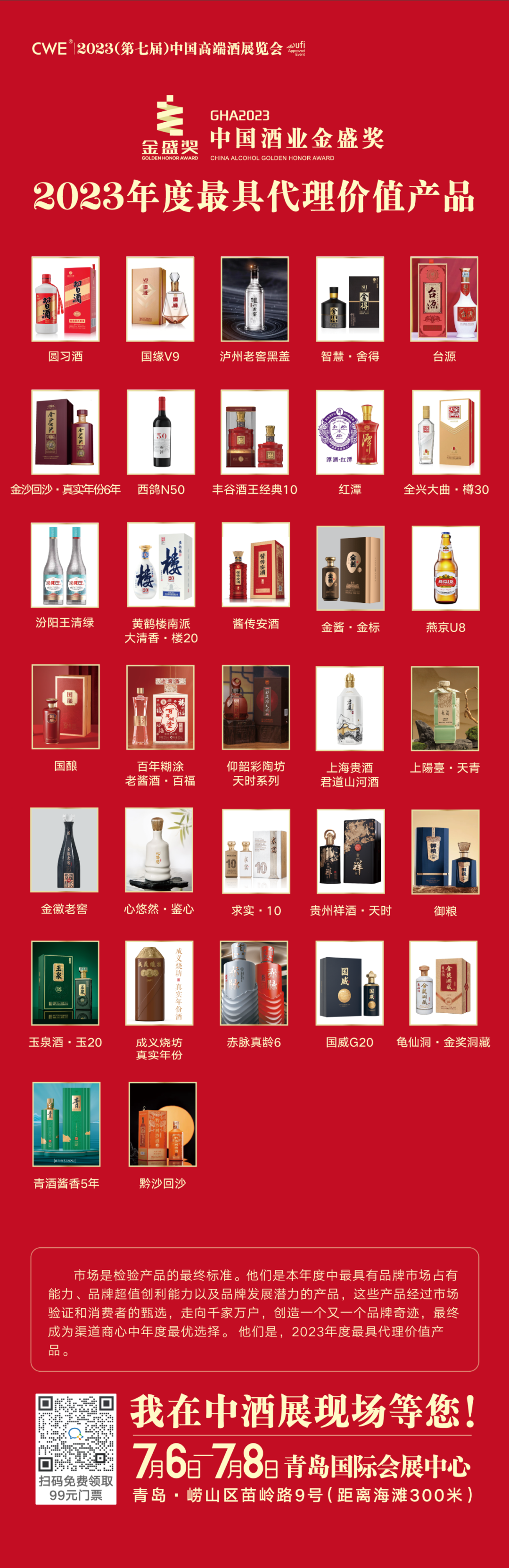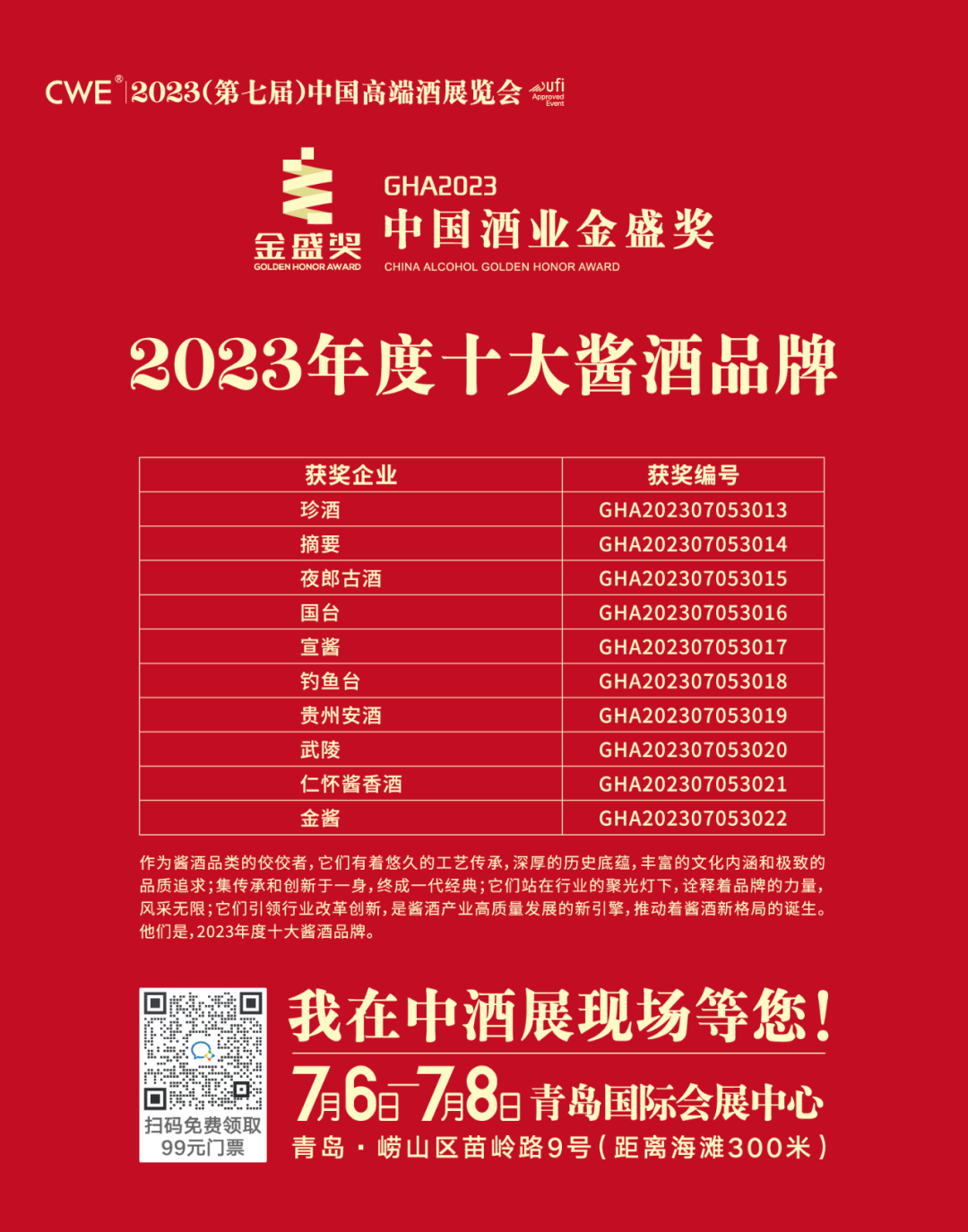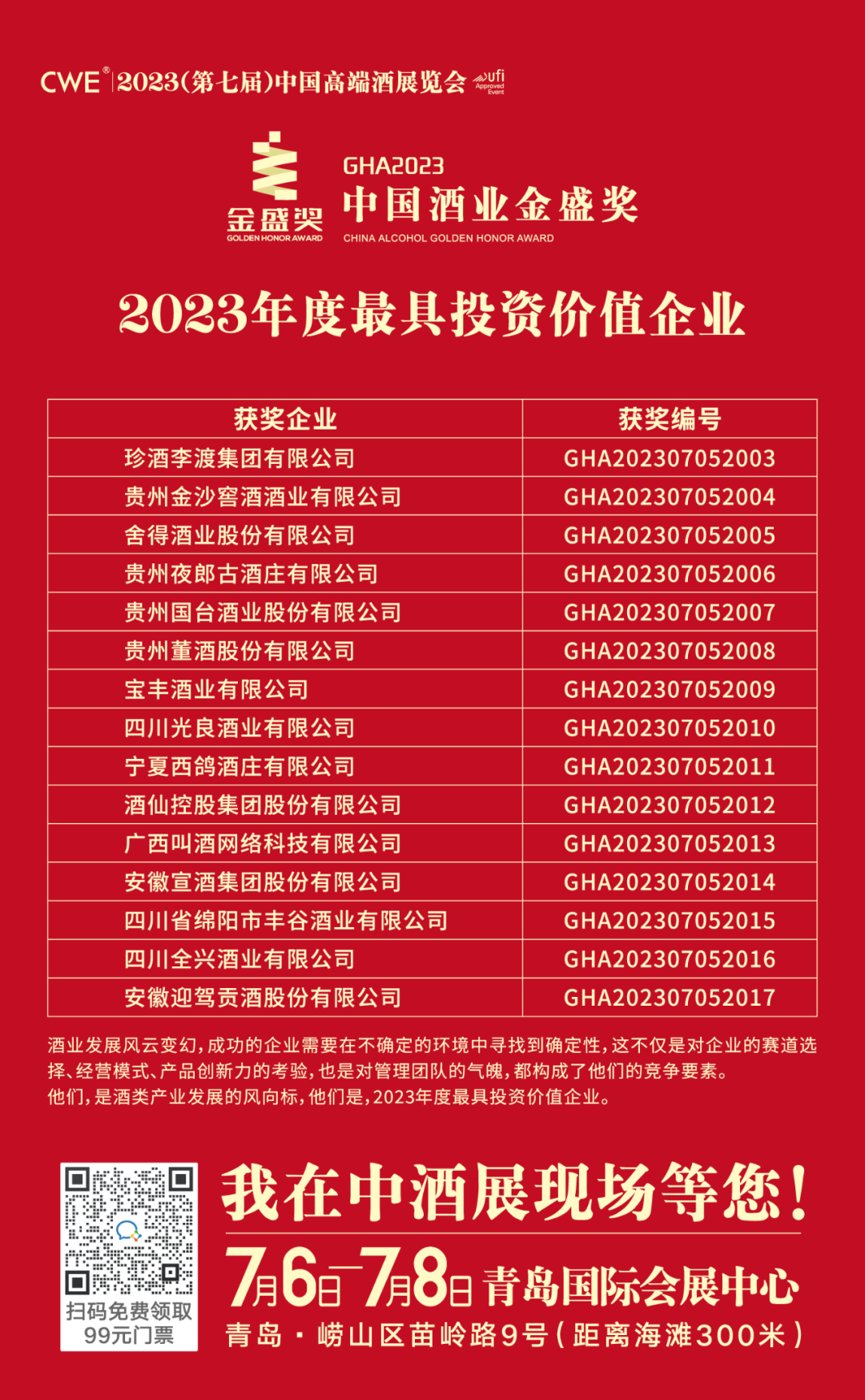7月5日,2023中国酒业金盛奖于2023(第七届)中酒展开展前一天圆满举办。酒业名企、专家、领军人物齐聚青岛,共同见证了2023中国酒业金盛奖全部榜单的诞生。
