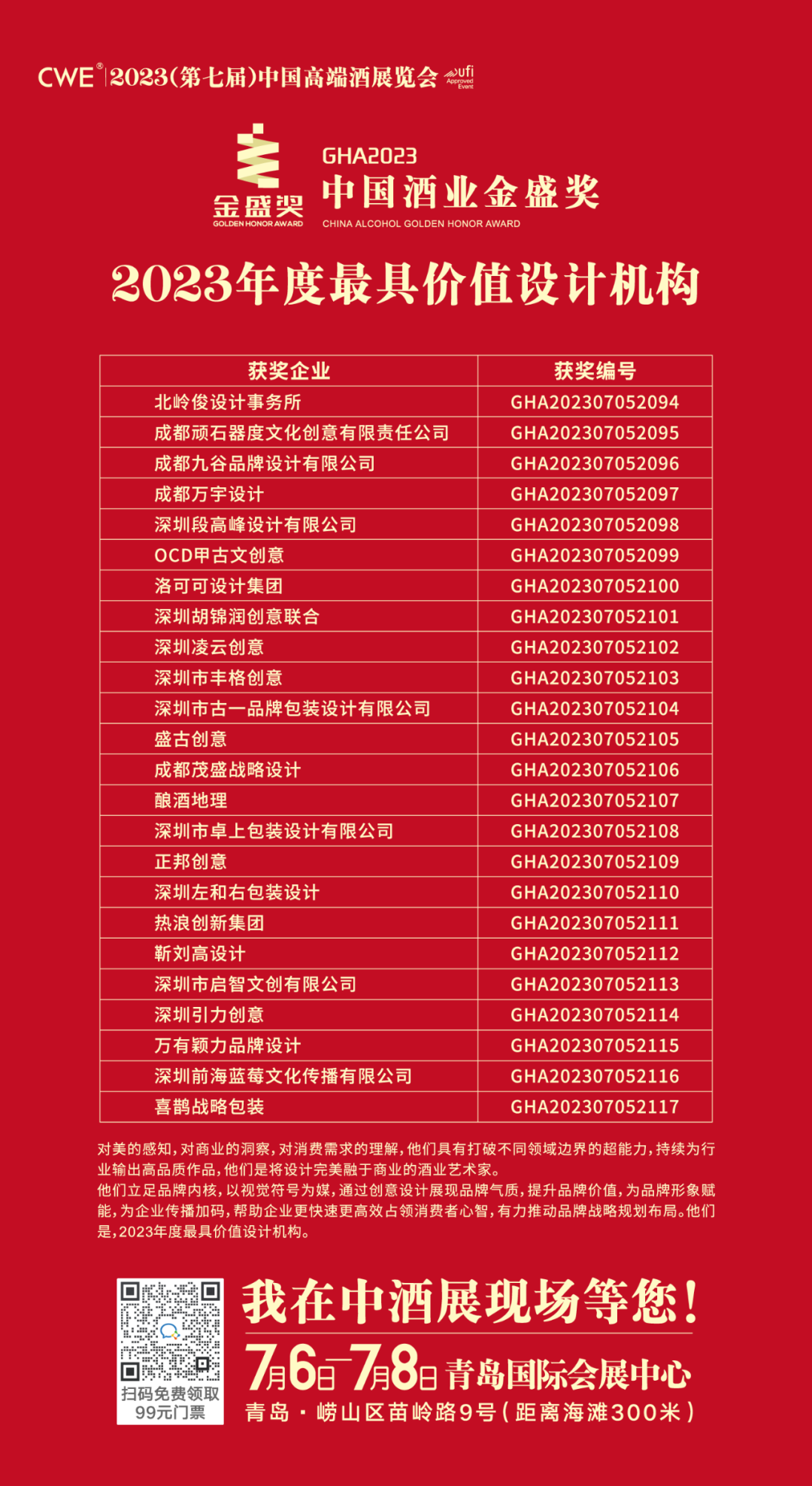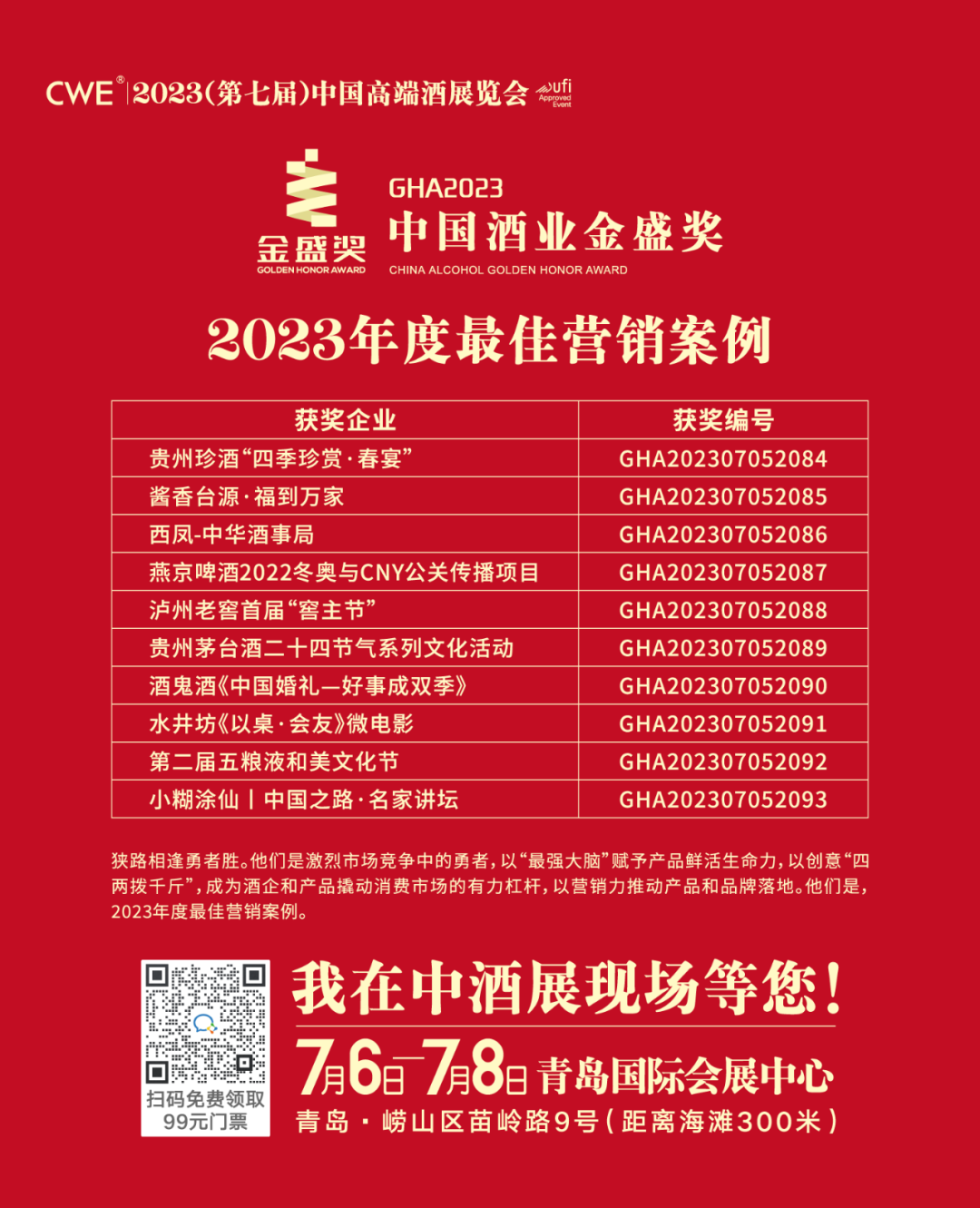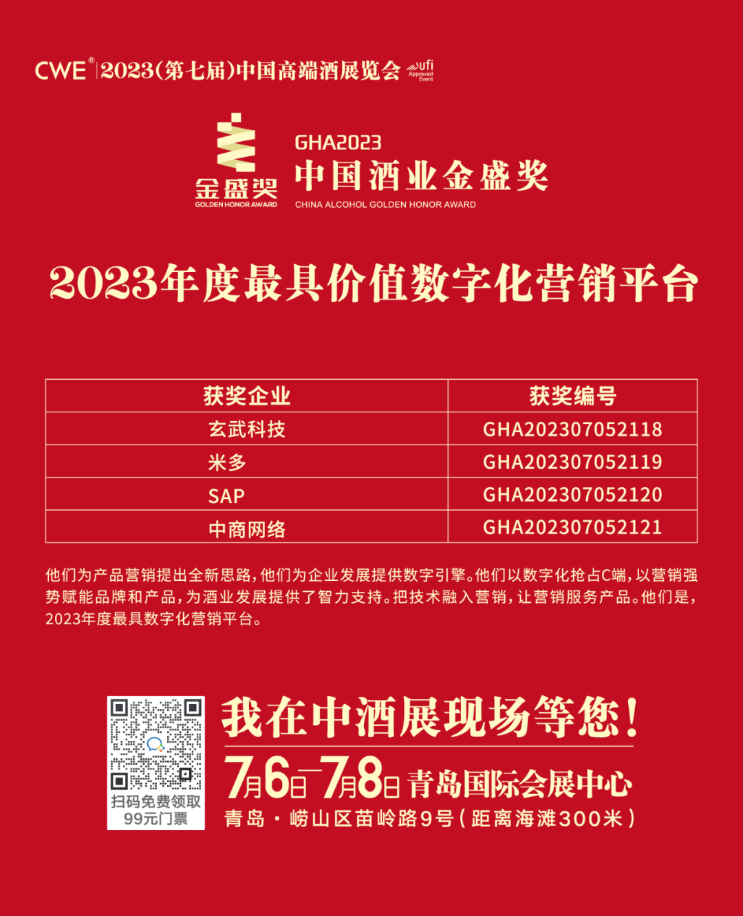 7月5日,2023中国酒业金盛奖于2023(第七届)中酒展开展前一天圆满举办。酒业名企、专家、领军人物齐聚青岛,共同见证了2023中国酒业金盛奖全部榜单的诞生。