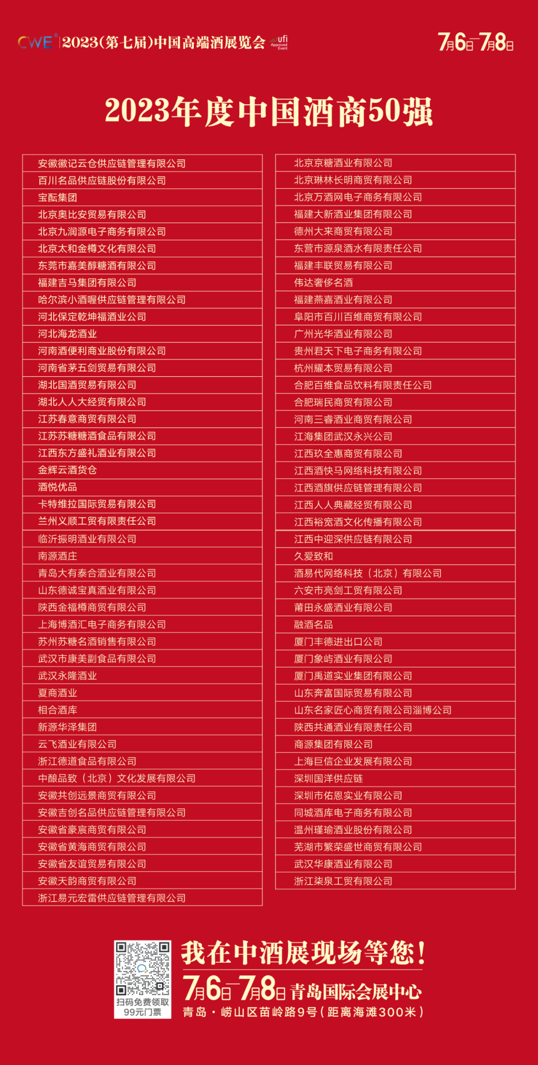 安徽徽记云仓供应链管理有限公司、百川名品供应链股份有限公司、宝酝集团等88家企业荣获“2023年度中国酒商50强”奖。