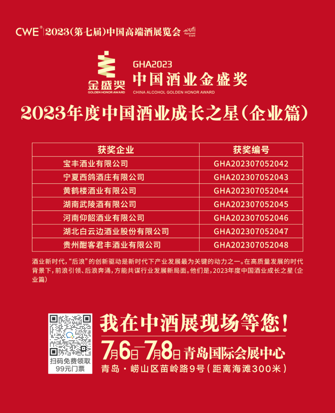 宝丰酒业有限公司、宁夏西鸽酒庄有限公司、黄鹤楼酒业有限公司等7家企业荣获“2023年度中国酒业成长之星(企业篇)”奖。