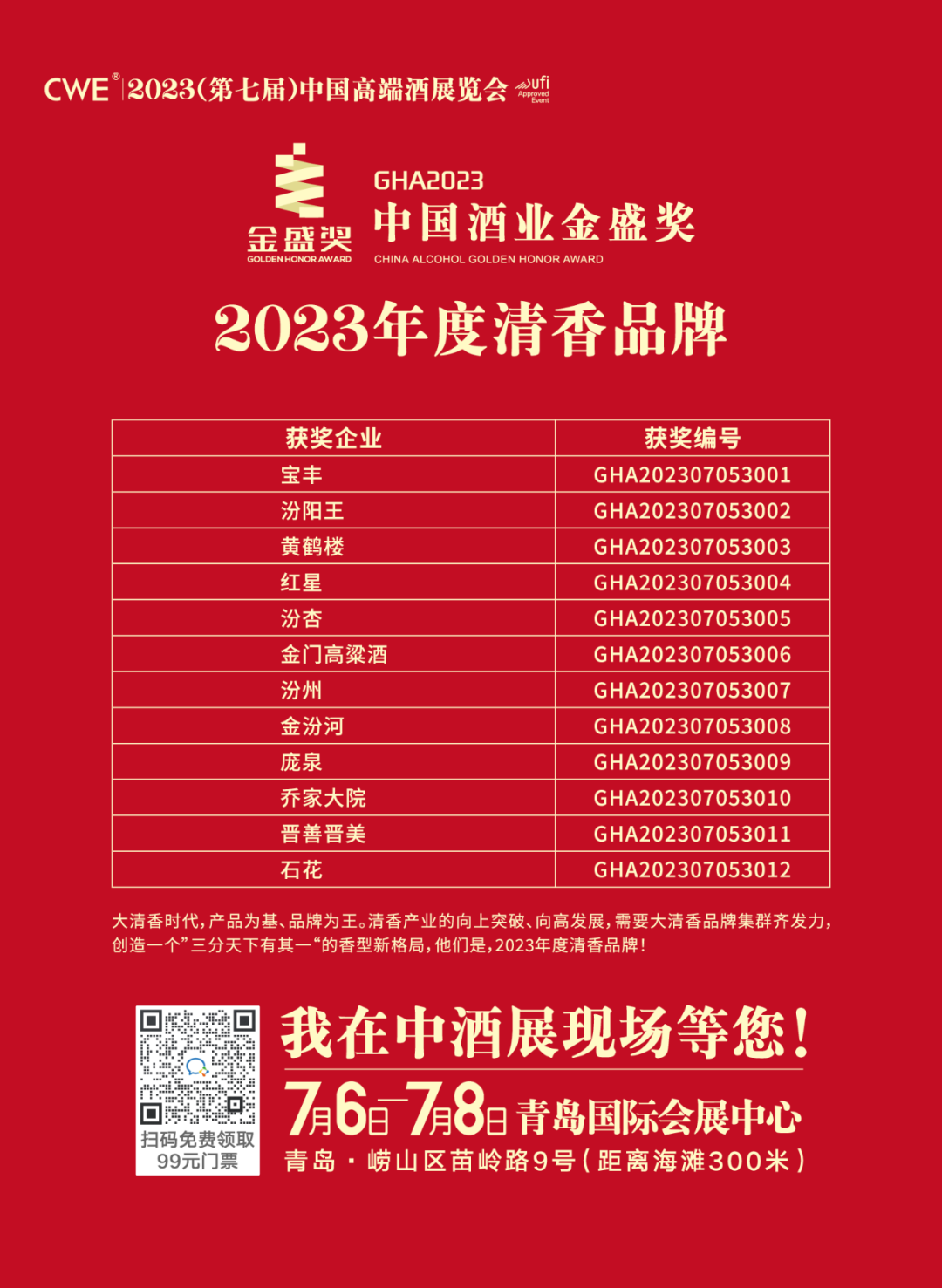宝丰、汾阳王、黄鹤楼等12个品牌荣获“2023年度清香品牌”奖。