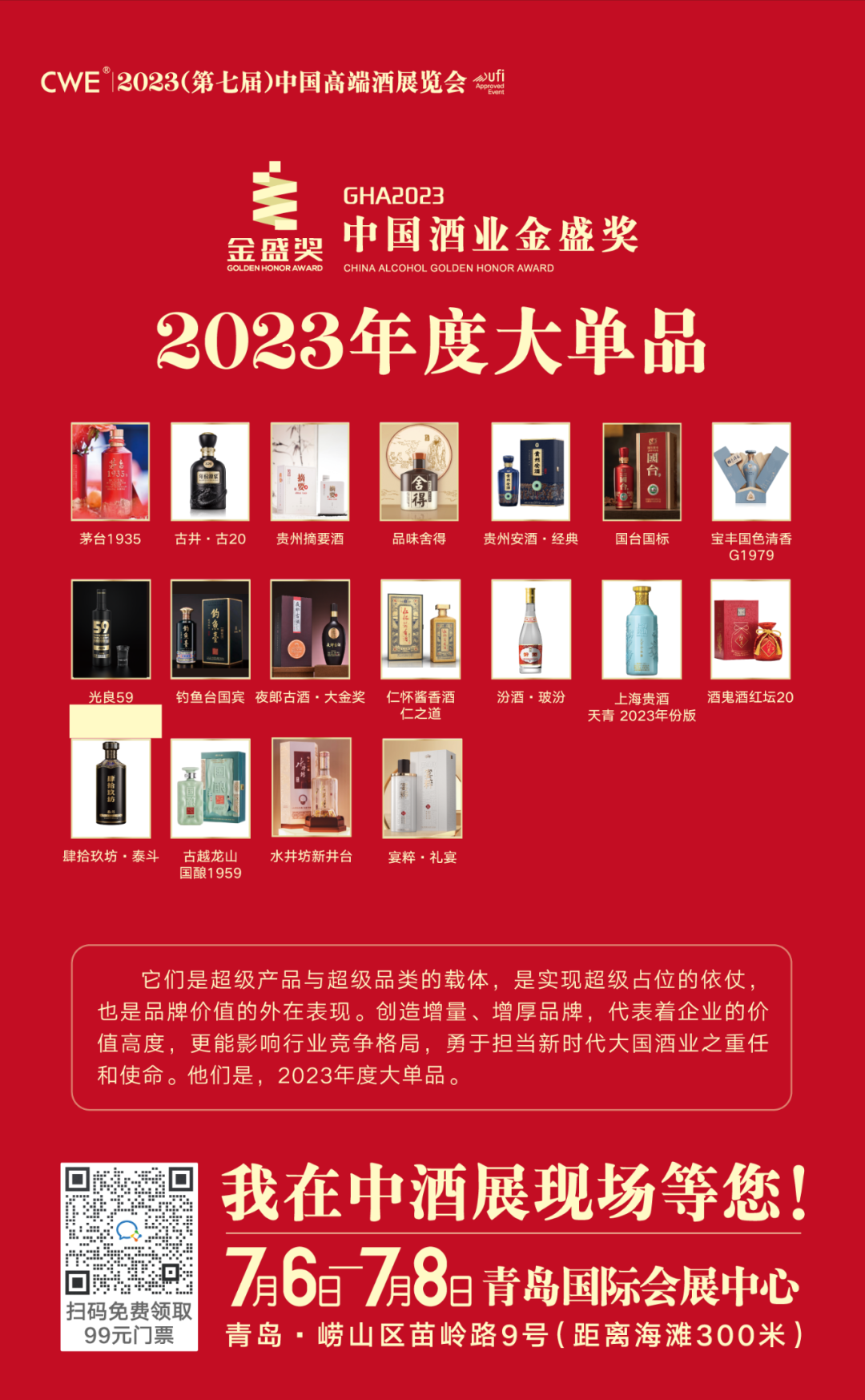 茅台1935、古井·古20、贵州摘要酒、上海贵酒·天青 2023年份版等18个产品荣获“2023年度大单品”奖。