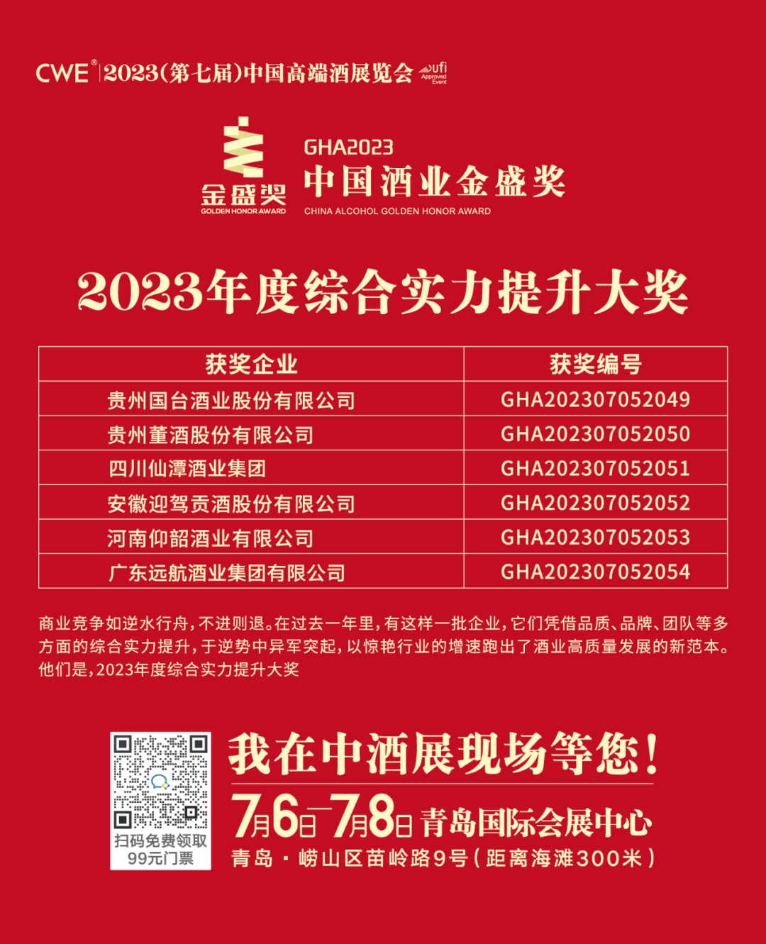 贵州国台酒业股份有限公司、贵州董酒股份有限公司、四川仙潭酒业集团等6家企业荣获“2023年度综合实力提升大奖”。