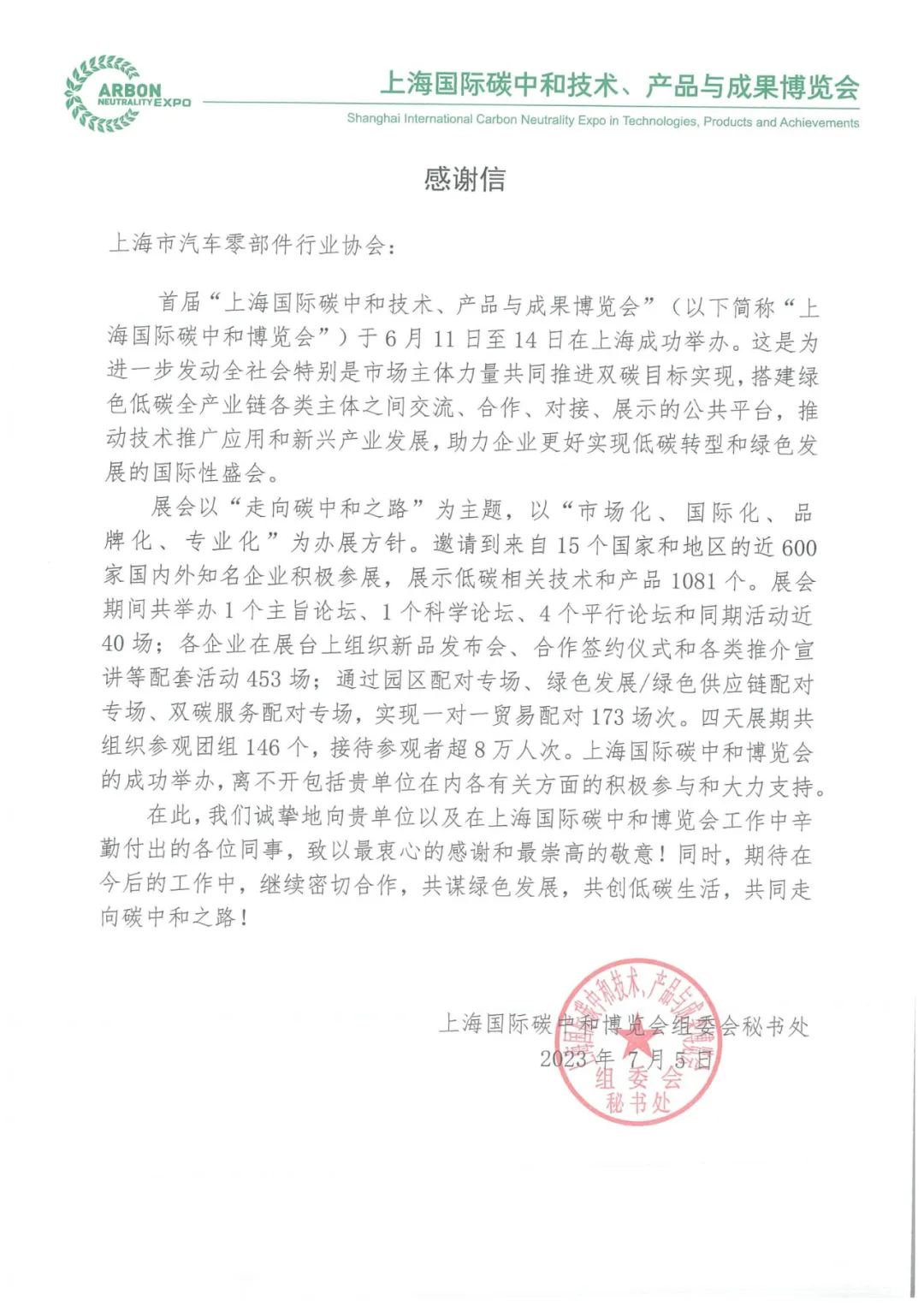 为感谢上海市汽车零部件协会对于首届上海国际碳中和博览会的大力支持,上海国际碳中和博览会组委会秘书处送予了《上海国际碳中和技术、产品与成果博览会感谢状》。上海国际碳中和博览会组委会秘书处和上海市汽车零部件行业协会通力合作,为广大产业同仁奉献了一场高品质的展会和论坛。上海国际碳中和博览会组委会秘书处对协会在上海国际碳中和博览会期间的工作表示感谢并给予了充分的肯定及高度的赞扬。