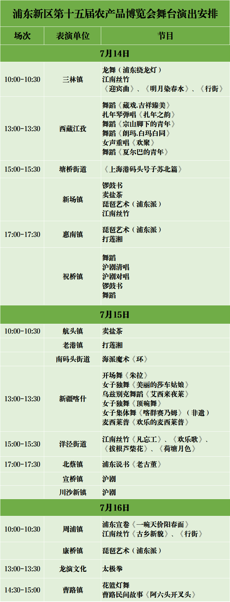 主活动区内布置舞台区,每天定时进行浦东非遗群众文化展演。节目单如下: