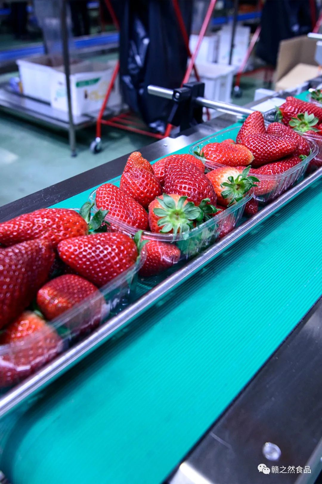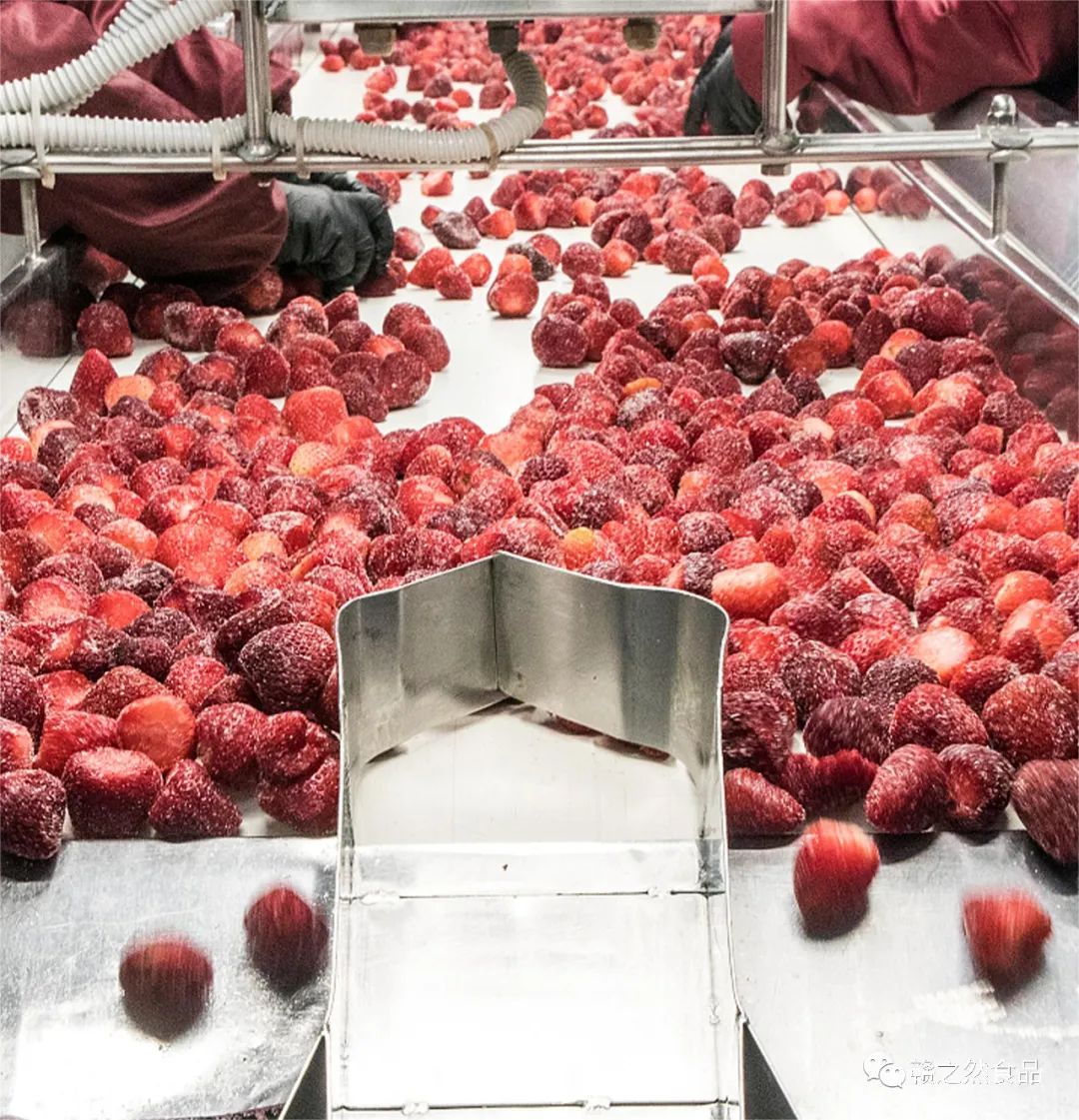 甄选出来的优质草莓会通过输送带去往果蔬清洗车间进一步清洗。