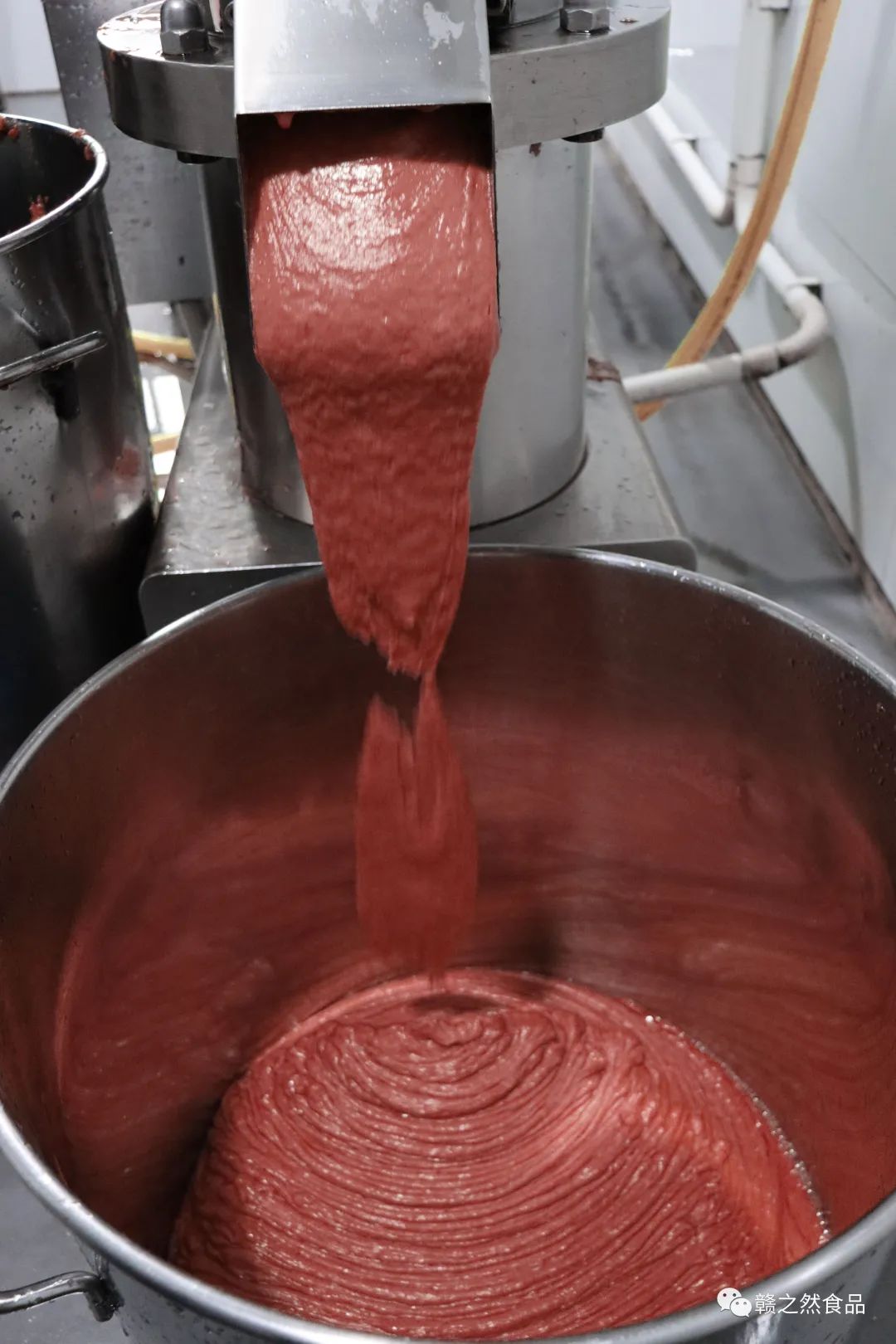 此图展示的是切碎后的草莓果肉进行一个精细化的打浆