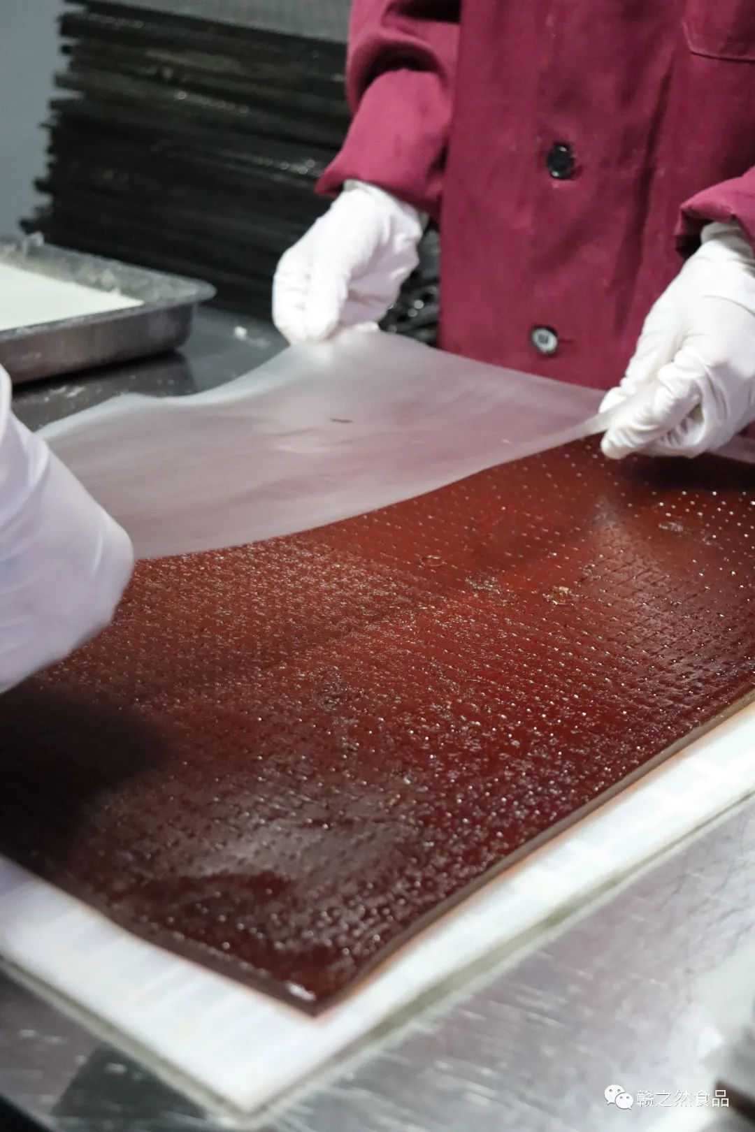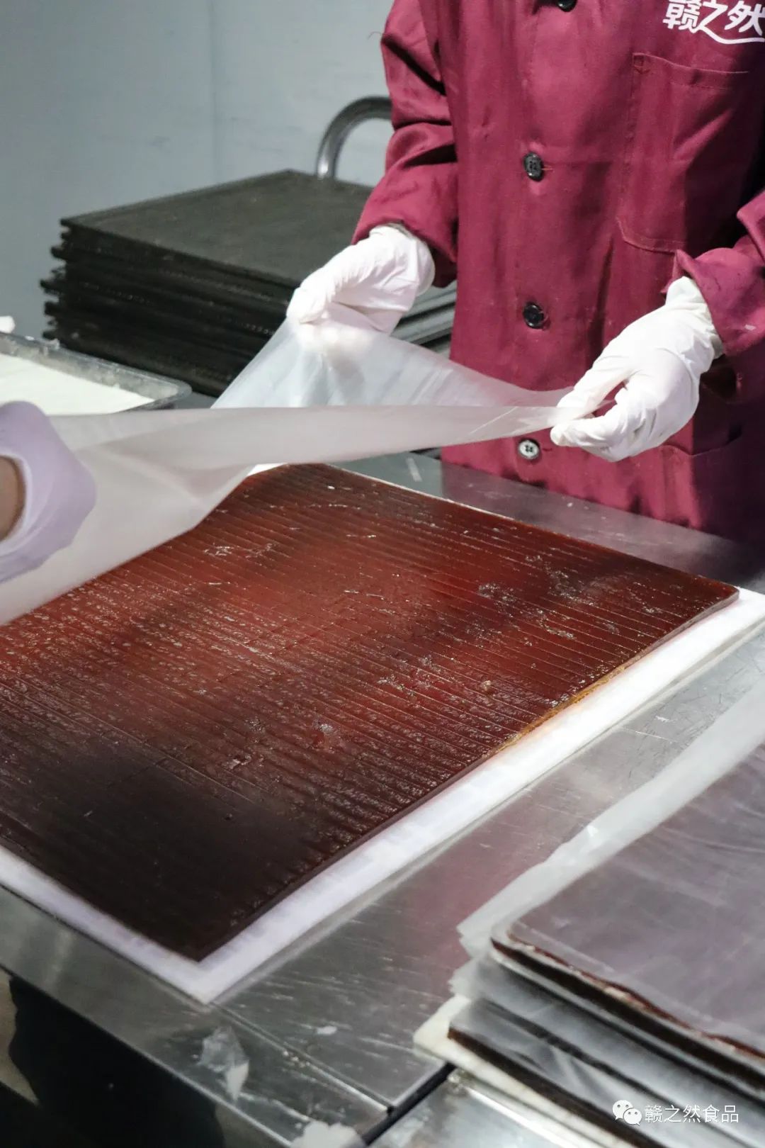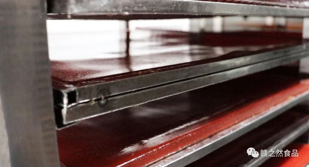 静静等待72小时,草莓水果条就制作完成了,这时的水果条更具有韧性和弹性,果香味扑鼻而来。我们赣之然食品公司一直模拟古法制作水果糕的方法来制作水果条,每个步骤都要仔细、用心。