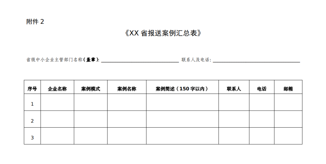 请各申报主体按照模板要求编制案例申报书(附件1);请各省级中小企业主管部门汇总整理申报案例并填写《XX省报送案例汇总表》(附件2)。请于2023年8月15日前将电子版材料和案例汇总表的盖章后扫描件发送至联系人邮箱。