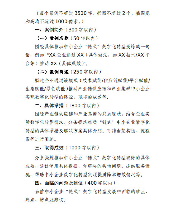 案例要突出推动中小企业“链式”数字化转型特色,实事求是、逻辑清晰、重点突出、数据详实,具有行业代表性,具备较强借鉴意义和复制推广价值,尽可能结合图、表等表达方式。