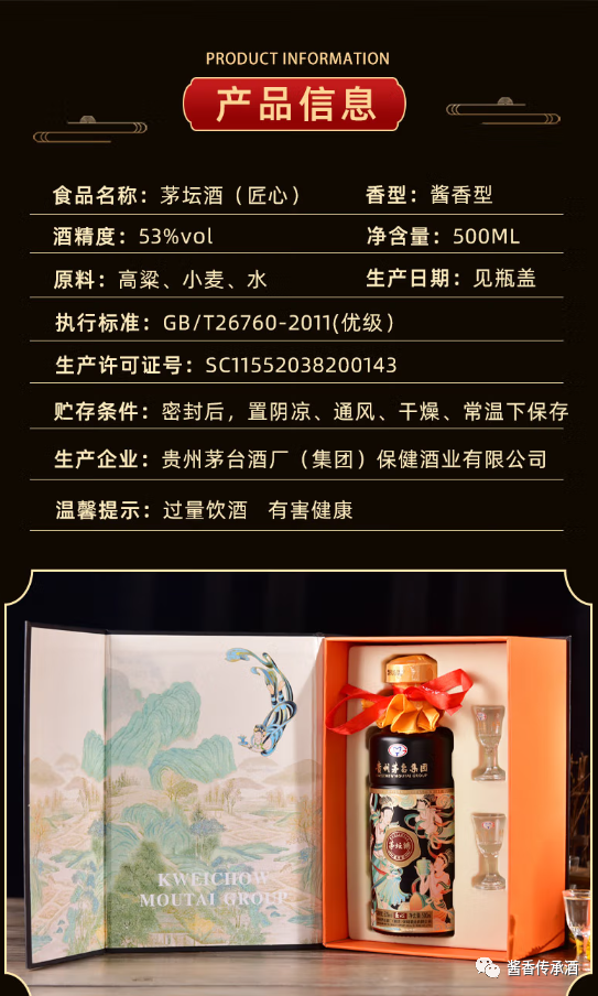 " 一股幽雅的芳香扑鼻而来,饮酒入喉,香味中夹杂着醇甜浓郁的酱香风味缓缓往下流。"这款匠心酒便很好地印证了这般感受。开瓶后,扑鼻而来的浓郁甘冽、酱香醇和,完全没有呛鼻的酒精味。倾倒时,大小如绿豆般的酒花析出,酒花丰富,清澈透亮 。