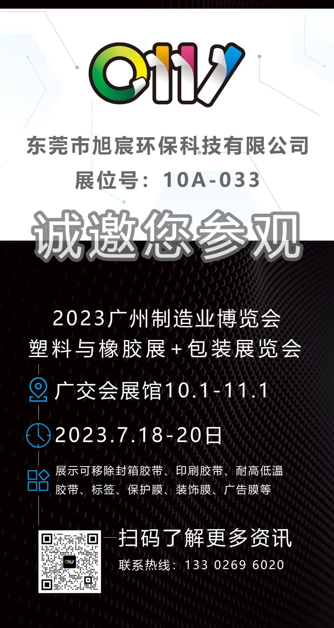 2023广州国际包装展览会,我们来啦!本次展览围绕包装系列产品展开,0111将秉承这一主题,展示新型的可移除包装系列产品,如矢量可移除胶带,矢量可移除标签,及矢量可移除保护膜、装饰膜、广告膜等,以满足不同的客户的需求,给您全面的包装胶粘制品解决方案。