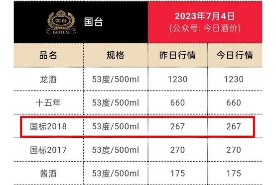 五粮液并非个例。国台国标酒500ml的零售价为699元每瓶,大公快消通过查询今日酒价发现,7月4日,国台国标酒的今日行情仅为267元每瓶。京东百亿补贴平台上,国台国标酒的售价为323元每瓶。