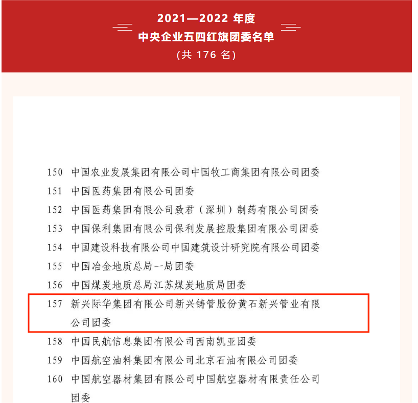 近期,中央企业团工委发布【2023】7号文,授予176个团委“中央企业五四红旗团委”称号,新兴铸管所属企业黄石新兴团委榜上有名!