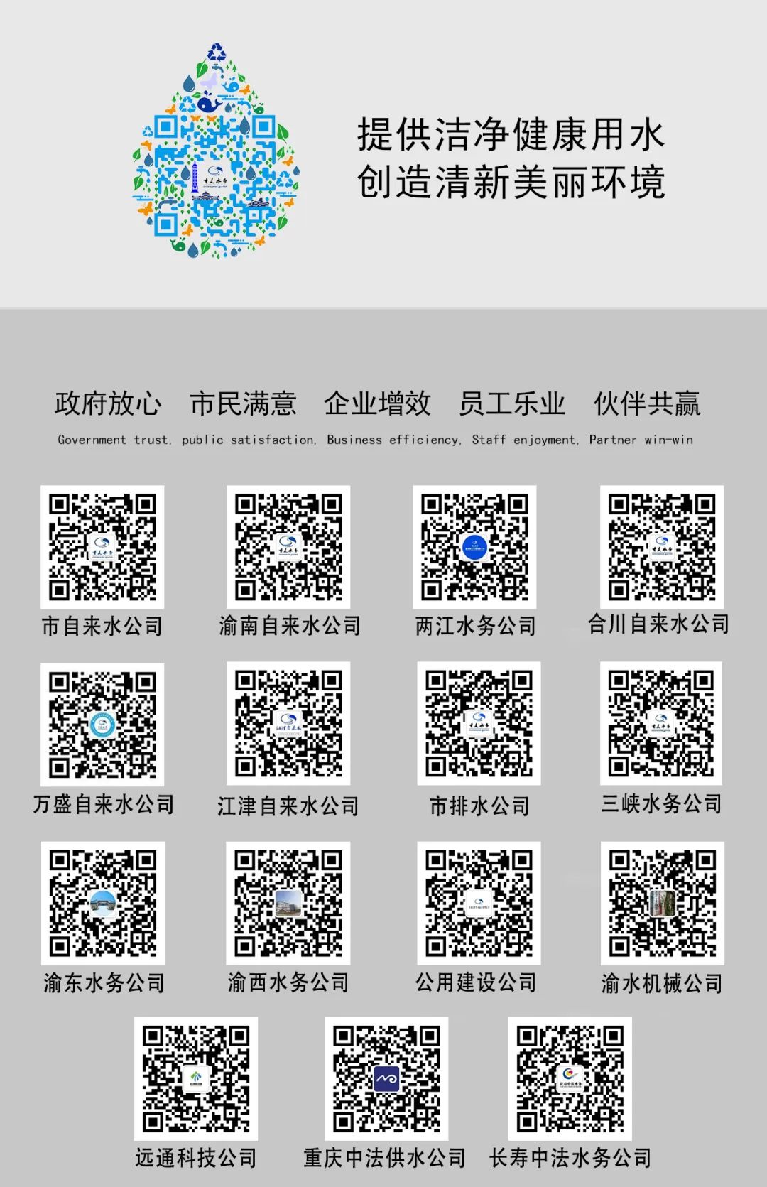 (一)重庆市渝东水务有限公司(以下简称“渝东水务”),系水务集团下属5家全资污水处理专业化管理公司之一。渝东水务于2009年7月挂牌成立,坐落于重庆市万州区,主要负责渝东北地区9个区县,3万多平方公里内城区/乡镇生活污水的收集和达标处理,服务人口超600万。渝东水务核心业务包括城区/乡镇生活污水处理厂及配套设施的运维和建设、排水主管网的运维和建设、生活垃圾渗滤液处理厂的运维等。渝东水务下设万川污水公司、开州排水公司、梁平排水公司、云阳排水公司、奉节排水公司、忠县排水公司、巫山排水公司、巫溪排水公司、城环排水公司、万州镇级污水公司等10个子公司,生活污水处理厂35座(含镇级厂),污水处理总规模58.16万m3/d。地址:重庆市万州区石柱坪8号。