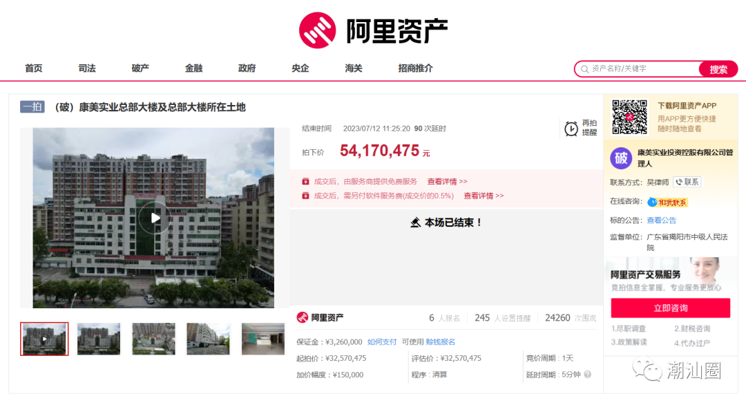 日前,康美实业总部大楼及总部大楼所在土地在阿里拍卖网进行拍卖。