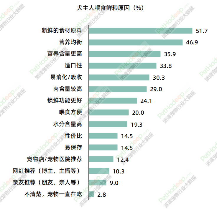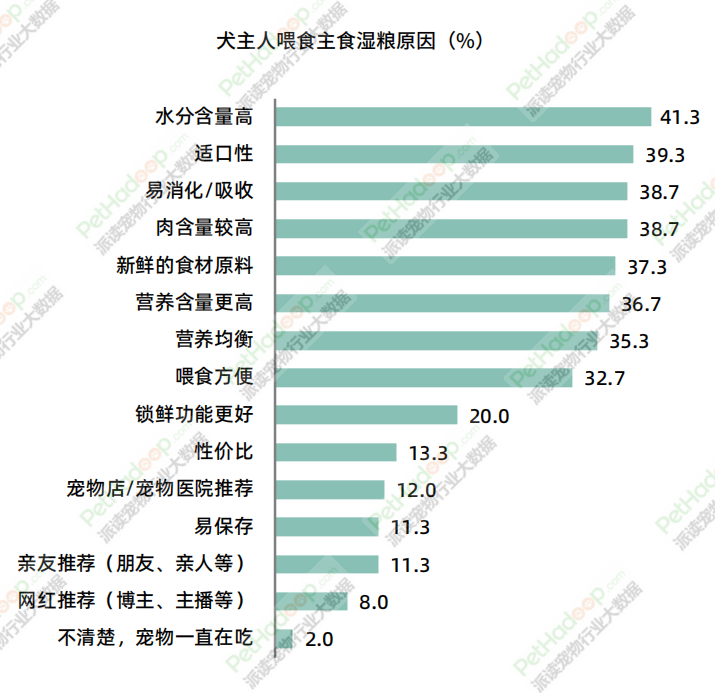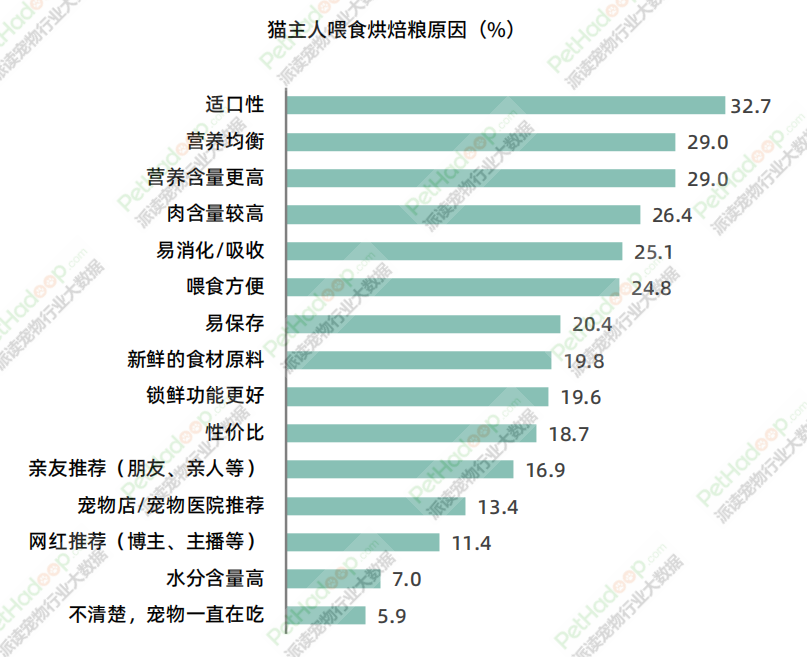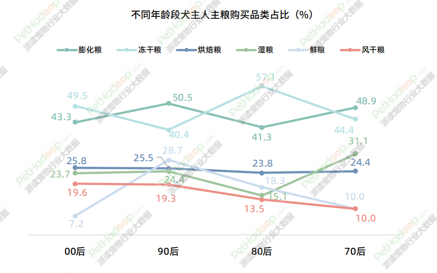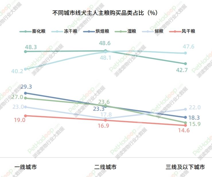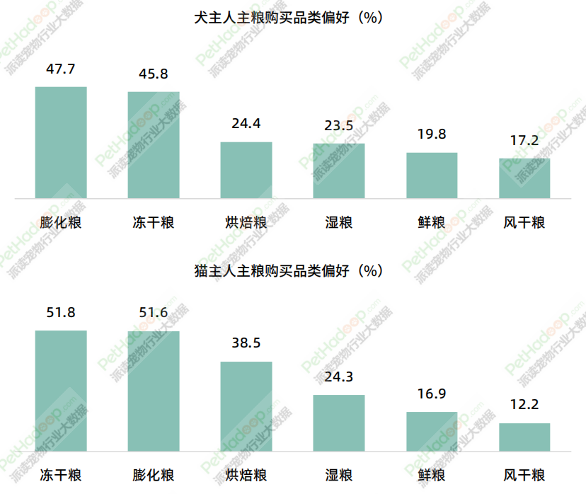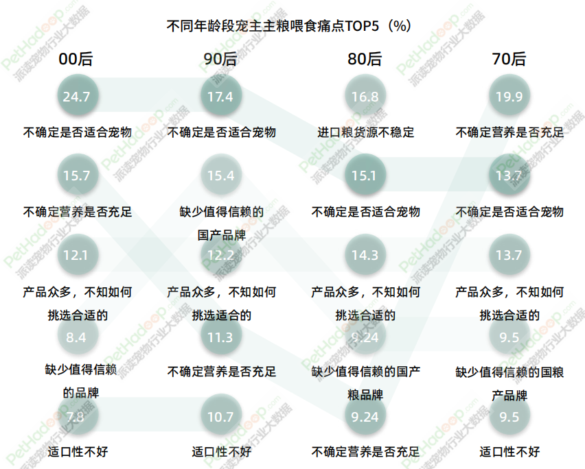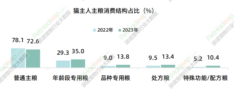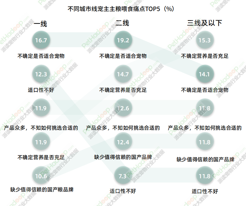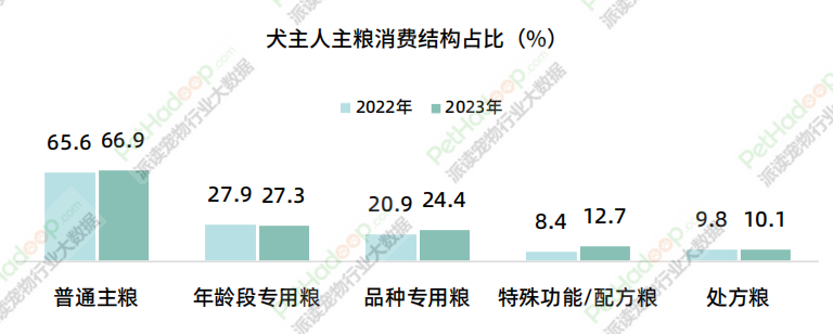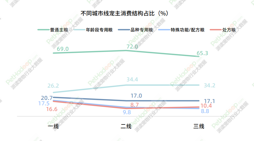 随着宠主养宠意识发生转变,猫普通粮购买率下降5.5%,年龄段专用粮、处方粮、品种专用粮等精细粮有所上升。但整体主粮消费结构占比中,普通主粮仍是现下的主流消费市场,占比72.6%;而细分营养粮市场,其中年龄段专用粮占比35%、品种专用粮占比13.8%、处方粮占比13.4%、特殊功能/配方粮占比10.4%。而犬主粮市场普通主粮也有小幅度提升,从65.6%提升至66.9%,年龄段专用粮从2022年的27.9%小幅下降至27.3%;而品种专用粮、特殊功能/配方粮和处方粮均有上升,其中上升幅度最为明显的是特殊功能/配方粮,较2022年相比上升了4.3个百分点,其次是品种专用粮,较2022年相比上升了3.5个百分点。从不同城市线来看,普通主粮是各类城市线宠主主要购买的品类,各城市的消费结构无明显区别。但相比之下,一线城市的宠主相对偏好品种专用粮、特殊功能/配方和处方粮,消费结构占比高于二线、三线及以下城市宠主。二线、三线及以下城市宠主偏好年龄段专用粮,分别为34.4%、34.2%。从不同宠主年龄段来看,普通主粮是各年龄段主要喂食的主粮品类,而00后宠主更偏好喂食年龄段专用粮,占比39.2%;但随着年龄的增长,宠主选择品种专用粮的偏好度逐渐上升。膨化粮、冻干粮是犬猫宠主主粮购买品类两大偏好。在犬主粮中,膨化粮仍是犬主人首选犬粮,但占比仅优先冻干粮1.9%;而猫宠主主粮偏好逐渐精细化,冻干粮偏好度反超膨化粮0.2个百分点,成为猫主人主要购买的主粮品类。从不同城市线来看,一线城市犬主人对烘焙粮、湿粮、鲜粮以及风干粮的偏好度高于二线、三线及以下城市犬主人,占比分别为29.3%、27%、23%、19%。二线、三线及以下城市犬主人对冻干粮的偏好度高于一线城市,占比分别为48.1%、47.6%。此外,三线及以下城市犬主人对膨化粮的偏好度低于一线、二线城市犬主人。同时,一线城市猫主人对烘培粮、湿粮的偏好度高于二线、三线及以下城市猫主人,占比分别为43.75、27.5%;二线城市猫主人膨化粮偏好度高于一线、三线及以下城市猫主人,占比为53.8%;三线及以下猫主人对鲜粮的偏好度高于一线、三线及以下城市猫主人,占比为20.7%。从不同宠主年龄段来看,膨化粮、冻干粮是各年龄段犬猫宠主主要购买的主粮品类,其中80后犬主人对冻干粮偏好度较高,为57.1%。90后犬主人对膨化粮偏好度较高,为50.5%。此外,90后、00后犬主人风干粮偏好度高于其他年龄段犬主人,占比分别为19.6%、19.3%。70后犬主人对湿粮偏好度高于其他年龄段犬主人,占比为31.1%。而猫主人品类偏好中,冻干粮更受中老年猫宠主偏好,而随着宠主年龄的增长,其对冻干粮的偏好度也逐渐上升。同时,70后猫宠主购买膨化粮的占比高于其他年龄段宠主,占比为66.2%。此外,90后猫宠主对湿粮的偏好度高于其他年龄段,占比为26.6%。80后猫主人对风干粮偏好度高于其他年龄段,占比为14.5%。犬猫宠主喂食的动因较为集中,犬猫主人在选择主粮时首先会考虑产品的营养是否均衡及其适口性。在烘焙粮犬主人喂食原因中,营养均衡占比33.3%,适口性占比30.3%,其次是营养含量更高、易消化/吸收,占比均在25%以上。而在猫主人喂食原因中,适口性占比32.7%,营养均衡占比29%,与之同等占比的还有营养含量更高。在冻干粮犬主人喂食原因中,适口性占比36.2%,营养均衡占比35.5%;而在猫主人喂食原因中,适口性占比43.3%,其次是肉含量较高,占比40.7%。在风干粮犬主人喂食原因中,34.9%的犬主人认为风干粮营养均衡选择喂食,33%的犬主人认为风干粮喂食方便选择喂食,32.1%的犬主人认为风干粮肉含量较高选择喂食,30.2%的犬主人认为风干粮营养含量更高选择喂食。而猫主人喂食原因主要还是营养均衡为主,占比34.9%,其次是喂食方便和肉含量较高,占比分别为33%、32.1%。湿粮与前几类主粮喂食动因不同,犬宠主最为关心的原因为水分含量是否高,占比为41.3%,其次是适口性、易消化/吸收、肉含量较高,占比均在39%左右。而猫宠主喂食原因也集中在水分含量高,占比为56.5%,其次是肉含量较高、适口性,占比分别为43.2%、38.5%。而在鲜粮部分,犬主人喂食鲜粮主要原因为食材原料是否新鲜,占比为51.7%,其次是营养均衡、营养含量更高,占比分别为46.9%、35.9%。猫主人的喂食鲜粮原因同犬主人相同,TOP3为新鲜的食材原料、营养均衡和营养含量更高,但占比相对较低,分别为38.9%、38.3、38.3%。在宠主主粮喂食痛点中,不确定主粮是否适合宠物、不确定主粮营养是否充足以及产品众多,不知如何挑选合适主粮是宠主痛点的TOP3,占比分别为17.9%、13.9%、12.3%,其次是缺少值得信赖的国产粮品牌,占比11.7%。其他痛点均未超过10%。从不同城市线来看,一线、二线城市宠主的喂食痛点主要以不确定是否适合宠物为主,三线以以下城市宠主的喂食痛点以不确定营养是否充足为主。除此之外,一线城市更关注产品的适口性如何。从不同年龄段来看,不确定是否适合宠物和不确定营养是否充足是各年龄段宠主的喂食痛点,其中00后宠主的占比要高于其他年龄段宠主,是其年龄段的主要消费痛点。对于90后来说,缺少值得信赖的国产品牌是其年龄段的主要消费痛点。而对于80后,进口粮货源不稳定是其主要消费痛点。