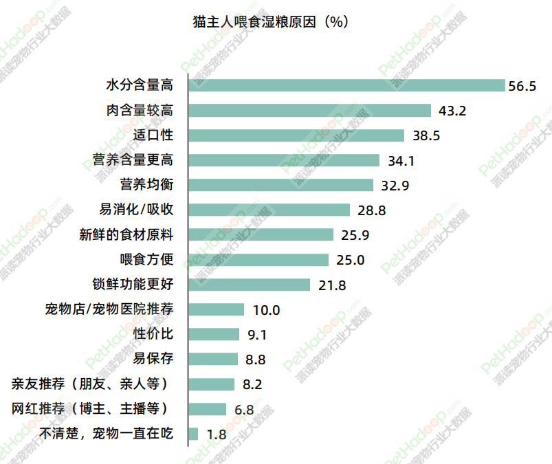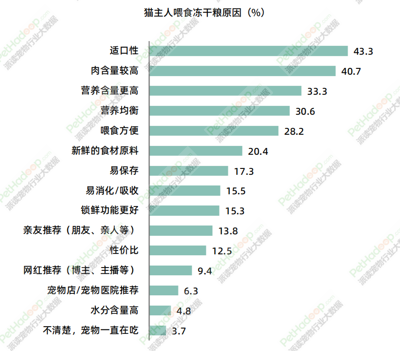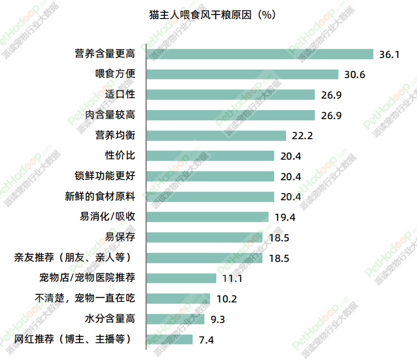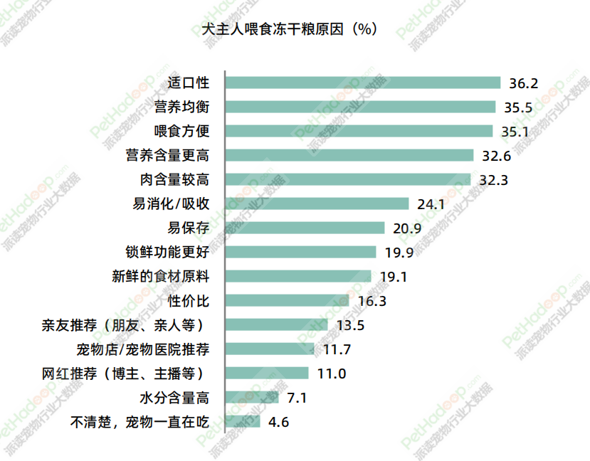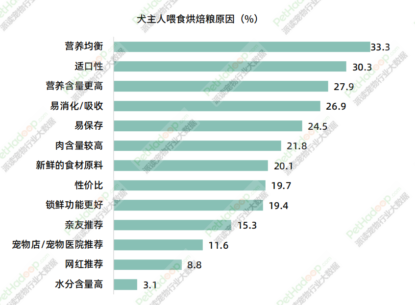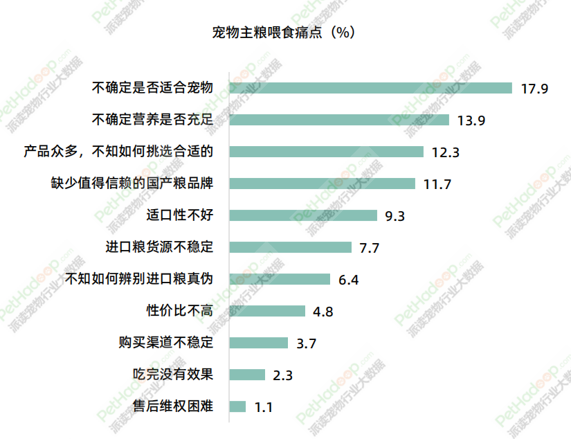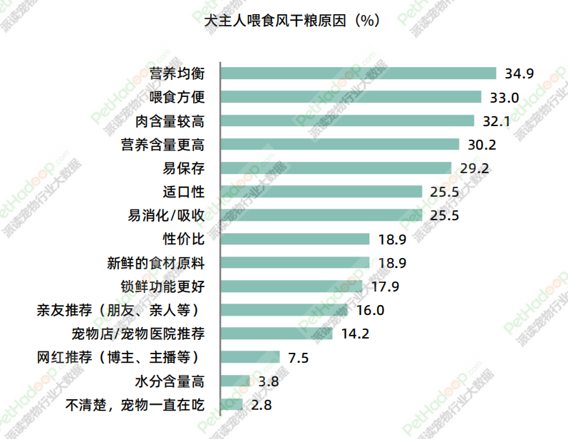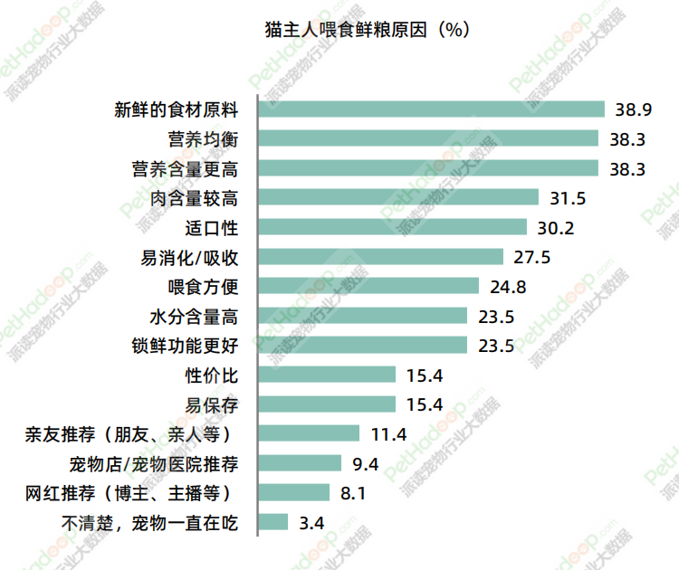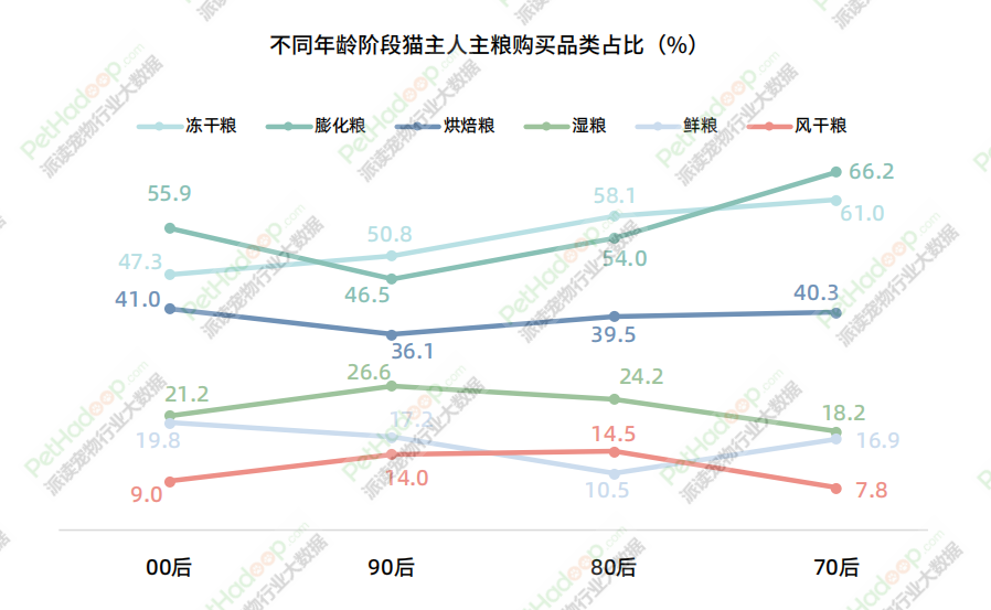 随着宠主养宠意识发生转变,猫普通粮购买率下降5.5%,年龄段专用粮、处方粮、品种专用粮等精细粮有所上升。但整体主粮消费结构占比中,普通主粮仍是现下的主流消费市场,占比72.6%;而细分营养粮市场,其中年龄段专用粮占比35%、品种专用粮占比13.8%、处方粮占比13.4%、特殊功能/配方粮占比10.4%。而犬主粮市场普通主粮也有小幅度提升,从65.6%提升至66.9%,年龄段专用粮从2022年的27.9%小幅下降至27.3%;而品种专用粮、特殊功能/配方粮和处方粮均有上升,其中上升幅度最为明显的是特殊功能/配方粮,较2022年相比上升了4.3个百分点,其次是品种专用粮,较2022年相比上升了3.5个百分点。从不同城市线来看,普通主粮是各类城市线宠主主要购买的品类,各城市的消费结构无明显区别。但相比之下,一线城市的宠主相对偏好品种专用粮、特殊功能/配方和处方粮,消费结构占比高于二线、三线及以下城市宠主。二线、三线及以下城市宠主偏好年龄段专用粮,分别为34.4%、34.2%。从不同宠主年龄段来看,普通主粮是各年龄段主要喂食的主粮品类,而00后宠主更偏好喂食年龄段专用粮,占比39.2%;但随着年龄的增长,宠主选择品种专用粮的偏好度逐渐上升。膨化粮、冻干粮是犬猫宠主主粮购买品类两大偏好。在犬主粮中,膨化粮仍是犬主人首选犬粮,但占比仅优先冻干粮1.9%;而猫宠主主粮偏好逐渐精细化,冻干粮偏好度反超膨化粮0.2个百分点,成为猫主人主要购买的主粮品类。从不同城市线来看,一线城市犬主人对烘焙粮、湿粮、鲜粮以及风干粮的偏好度高于二线、三线及以下城市犬主人,占比分别为29.3%、27%、23%、19%。二线、三线及以下城市犬主人对冻干粮的偏好度高于一线城市,占比分别为48.1%、47.6%。此外,三线及以下城市犬主人对膨化粮的偏好度低于一线、二线城市犬主人。同时,一线城市猫主人对烘培粮、湿粮的偏好度高于二线、三线及以下城市猫主人,占比分别为43.75、27.5%;二线城市猫主人膨化粮偏好度高于一线、三线及以下城市猫主人,占比为53.8%;三线及以下猫主人对鲜粮的偏好度高于一线、三线及以下城市猫主人,占比为20.7%。从不同宠主年龄段来看,膨化粮、冻干粮是各年龄段犬猫宠主主要购买的主粮品类,其中80后犬主人对冻干粮偏好度较高,为57.1%。90后犬主人对膨化粮偏好度较高,为50.5%。此外,90后、00后犬主人风干粮偏好度高于其他年龄段犬主人,占比分别为19.6%、19.3%。70后犬主人对湿粮偏好度高于其他年龄段犬主人,占比为31.1%。而猫主人品类偏好中,冻干粮更受中老年猫宠主偏好,而随着宠主年龄的增长,其对冻干粮的偏好度也逐渐上升。同时,70后猫宠主购买膨化粮的占比高于其他年龄段宠主,占比为66.2%。此外,90后猫宠主对湿粮的偏好度高于其他年龄段,占比为26.6%。80后猫主人对风干粮偏好度高于其他年龄段,占比为14.5%。犬猫宠主喂食的动因较为集中,犬猫主人在选择主粮时首先会考虑产品的营养是否均衡及其适口性。在烘焙粮犬主人喂食原因中,营养均衡占比33.3%,适口性占比30.3%,其次是营养含量更高、易消化/吸收,占比均在25%以上。而在猫主人喂食原因中,适口性占比32.7%,营养均衡占比29%,与之同等占比的还有营养含量更高。在冻干粮犬主人喂食原因中,适口性占比36.2%,营养均衡占比35.5%;而在猫主人喂食原因中,适口性占比43.3%,其次是肉含量较高,占比40.7%。在风干粮犬主人喂食原因中,34.9%的犬主人认为风干粮营养均衡选择喂食,33%的犬主人认为风干粮喂食方便选择喂食,32.1%的犬主人认为风干粮肉含量较高选择喂食,30.2%的犬主人认为风干粮营养含量更高选择喂食。而猫主人喂食原因主要还是营养均衡为主,占比34.9%,其次是喂食方便和肉含量较高,占比分别为33%、32.1%。湿粮与前几类主粮喂食动因不同,犬宠主最为关心的原因为水分含量是否高,占比为41.3%,其次是适口性、易消化/吸收、肉含量较高,占比均在39%左右。而猫宠主喂食原因也集中在水分含量高,占比为56.5%,其次是肉含量较高、适口性,占比分别为43.2%、38.5%。而在鲜粮部分,犬主人喂食鲜粮主要原因为食材原料是否新鲜,占比为51.7%,其次是营养均衡、营养含量更高,占比分别为46.9%、35.9%。猫主人的喂食鲜粮原因同犬主人相同,TOP3为新鲜的食材原料、营养均衡和营养含量更高,但占比相对较低,分别为38.9%、38.3、38.3%。在宠主主粮喂食痛点中,不确定主粮是否适合宠物、不确定主粮营养是否充足以及产品众多,不知如何挑选合适主粮是宠主痛点的TOP3,占比分别为17.9%、13.9%、12.3%,其次是缺少值得信赖的国产粮品牌,占比11.7%。其他痛点均未超过10%。从不同城市线来看,一线、二线城市宠主的喂食痛点主要以不确定是否适合宠物为主,三线以以下城市宠主的喂食痛点以不确定营养是否充足为主。除此之外,一线城市更关注产品的适口性如何。从不同年龄段来看,不确定是否适合宠物和不确定营养是否充足是各年龄段宠主的喂食痛点,其中00后宠主的占比要高于其他年龄段宠主,是其年龄段的主要消费痛点。对于90后来说,缺少值得信赖的国产品牌是其年龄段的主要消费痛点。而对于80后,进口粮货源不稳定是其主要消费痛点。