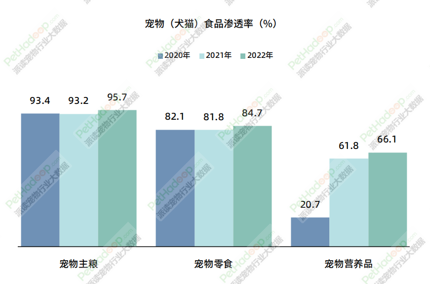 宠物行业白皮书结合《2023年中国宠物食品消费报告》报告数据,从多维度总结2023年中国宠物食品行业的发展趋势。食品作为刚需产品,是整个宠物消费市场规模的最大细分市场,又伴随着精细化高营养养宠趋势,即便在疫情因素影响下,食品市场也仍然保持活力。报告显示,犬食品消费市场规模较往年基本持平,猫食品市场则有大幅提升,较往年增长15.6%。在食品市场结构中,主粮市场份额稳定,宠物犬零食市场份额轻微下滑,营养品市场份额小幅度上升。其中犬主粮市场份额为68.9%,较往年仅提升0.5%;零食市场份额为27.1%,较往年降低1.1%;营养品市场份额为4%,较往年上升0.6%。而猫主粮市场份额为70.3%,较往年下降0.4%;零食市场份额为25.4%,较往年持平;营养品市场份额为4.3%,较往年上升0.4%。犬猫营养品市场份额的提升,与当下精细化高营养养宠所推动的消费趋势相吻合。从宠物食品市场渗透率来看,主粮作为宠物的刚需,渗透率要高于其它品类,并保持增长速度,占比95.7%,较往年上升2.5%;零食渗透率为84.7%,较往年上升2.9%其中犬零食渗透率高于猫3.7%;营养品渗透率66.1%,较往年上升4.3%,犬猫持一致水平状态。