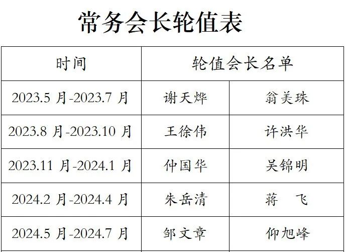 从2023年5月开始,以每三个月1个轮值期,每个轮值期由2名常务会长负责当期轮值。轮值会长在轮值期内全权主持协会工作,根据会长办公会议的工作部署,负责推进协会的各项工作进展,指导和督促秘书处日常工作的开展。