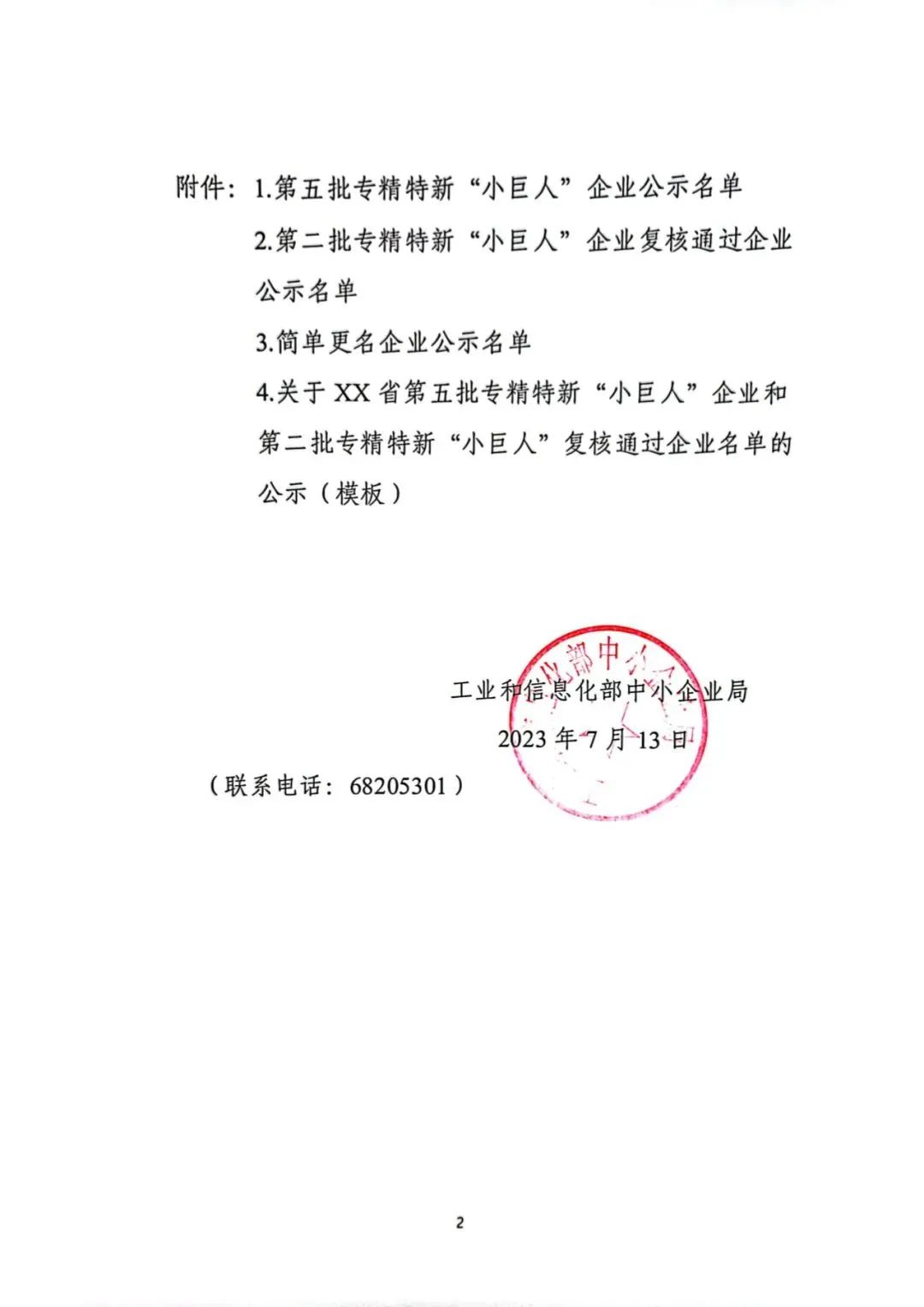 2023年7月14日,工业和信息化部中小企业局发布《关于公示专精特新“小巨人”企业名单的函》,公示原文:
