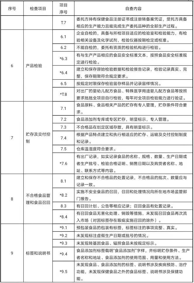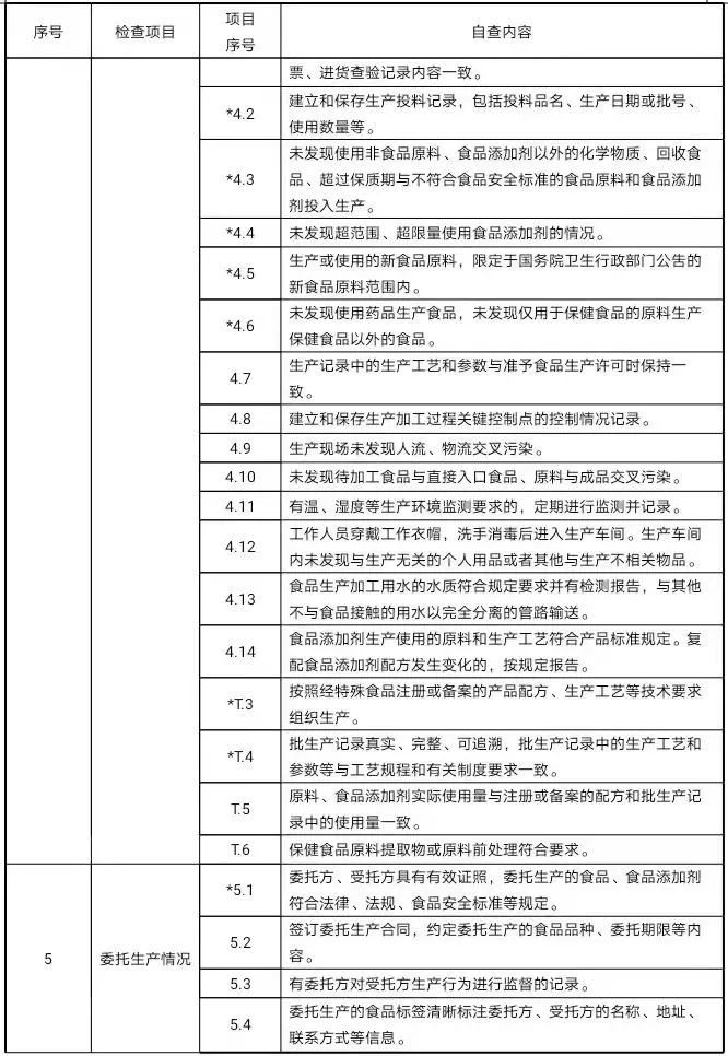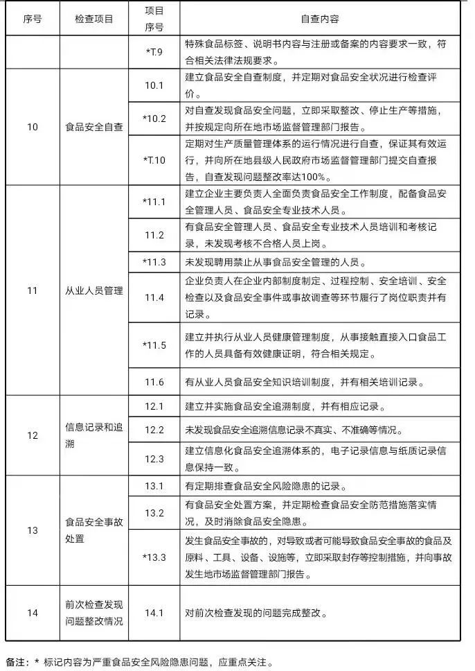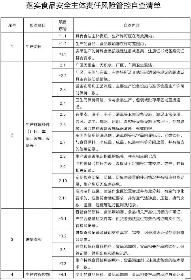 1.3日管控内容日管控检查应覆盖以下内容:生产资质、生产环境条件(厂区、车间、设施、设备等)(★)、进货查验(★)、生产过程控制(★)、产品检验(★)、贮存及交付控制(★)、标签和说明书(★)、从业人员管理(★)、前次检查发现问题整改情况(★),具体参照《落实食品安全主体责任风险管控清单》,其中“(★)”标记项目为重点检查内容。