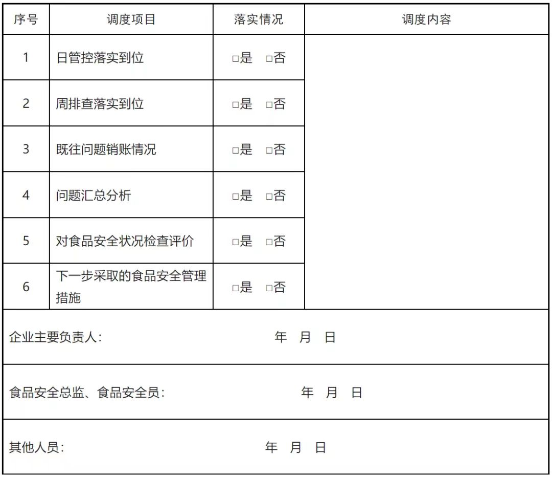 相关记录:《每日食品安全检查记录表》《每周食品安全排查记录表》《月调度记录和管理表》