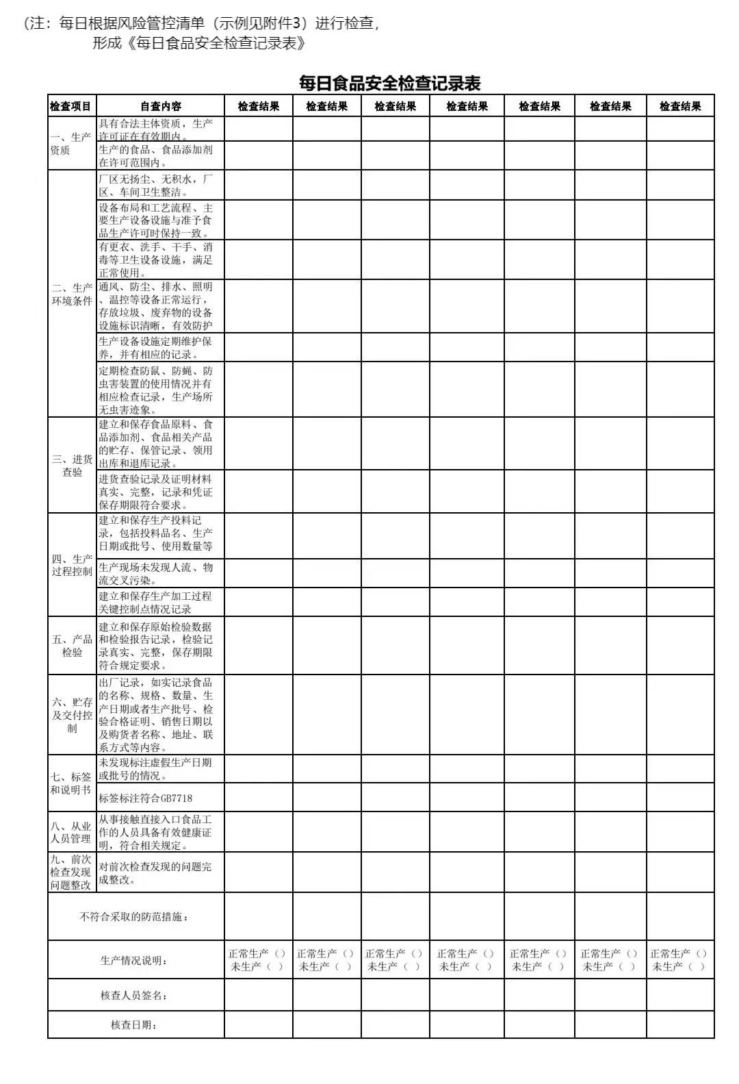 1.4.1正常生产期间,食品安全员每日根据公司《落实食品安全主体责任风险管控清单》进行检查,排查生产加工各个环节可能存在的食品安全风险隐,并将检查结果汇总记录在《每日食品安全检查记录表》上,可采用电子表格的形式予以记录。未发现问题的,也应当予以记录。