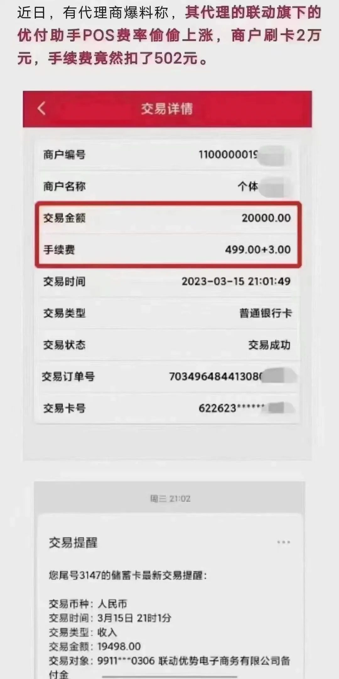 ③、联动优势-优pos:2.5%+3(即刷一万扣手续费253元);联动优势Epos 1%+3(即刷一万扣手续费103元)