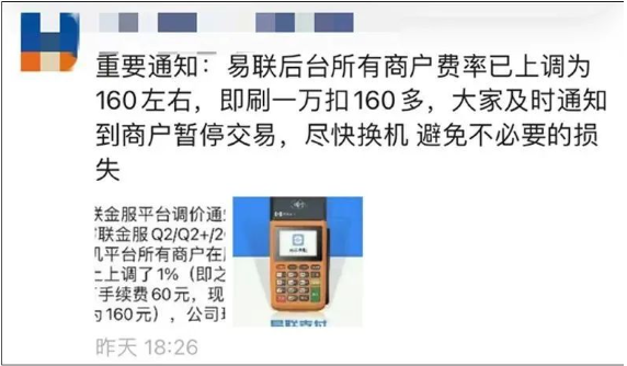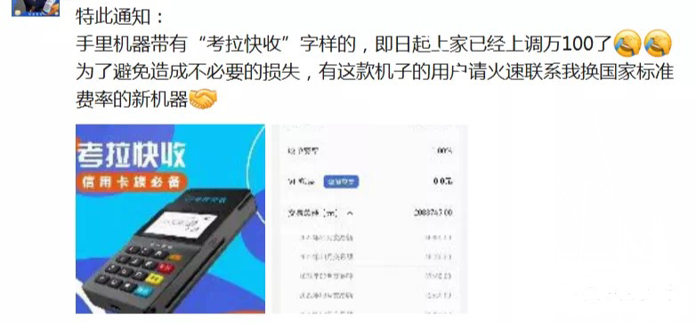 前些天,有部分合利宝、国通、拉卡拉、电银费率上调。这两天收到卡友的消息,又涉及乐刷收付贝,联动优POS等产品。