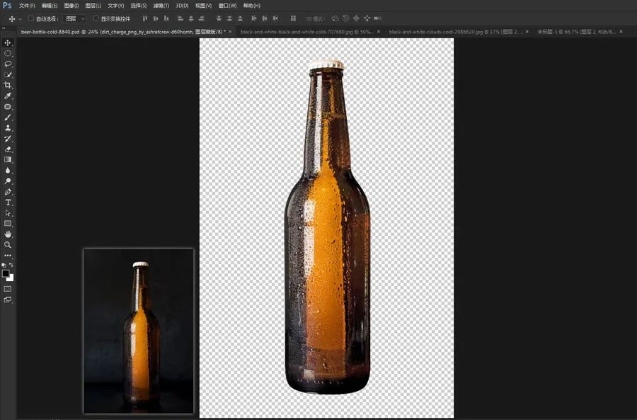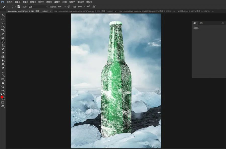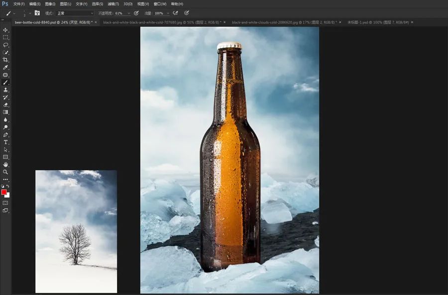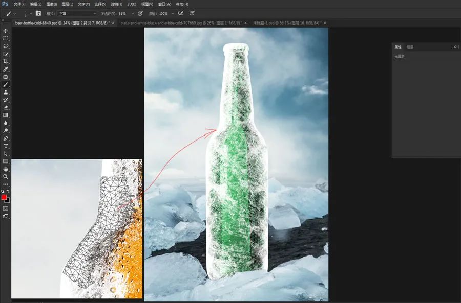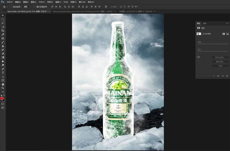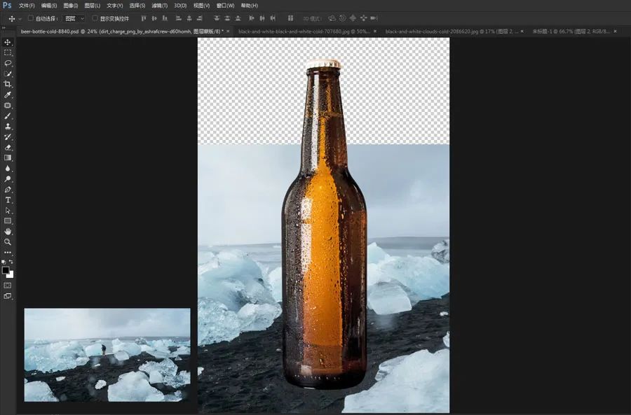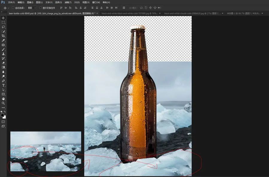 10、将这个雪的素材拖入啤酒的文档,放到啤酒的边缘。